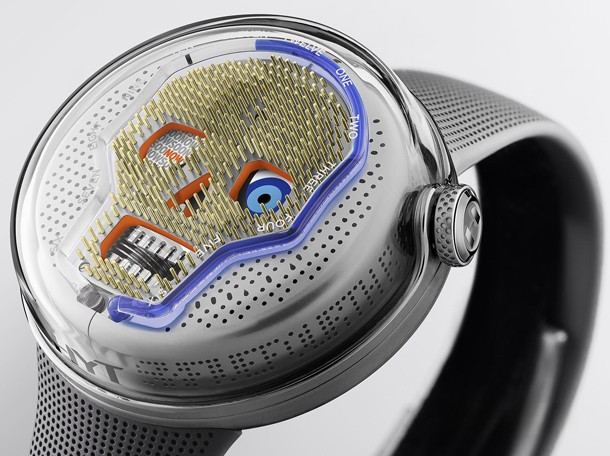 Корпус часов HYT Skull H0 Soonow диаметром 48.8 мм выполнен из нержавеющей стали. На серебристом циферблате отображаются часы, минуты, секунды, запас хода. Сквозь заднюю крышку корпуса можно видеть работу сложного механизма, приводящего в действие жидкостный модуль. Калибр с ручным заводом разработан совместно Chronode. Его балансовая частота составляет 4 Гц, запас хода 65 часов. Мосты скошены вручную и украшены женевскими волнами. Модель HYT H0 Soonow представлена на каучуковом ремешке с застежкой из титана. Серия ограничена - 25 шт.