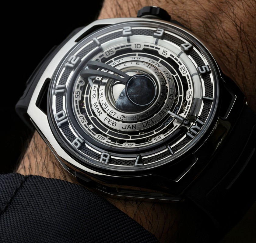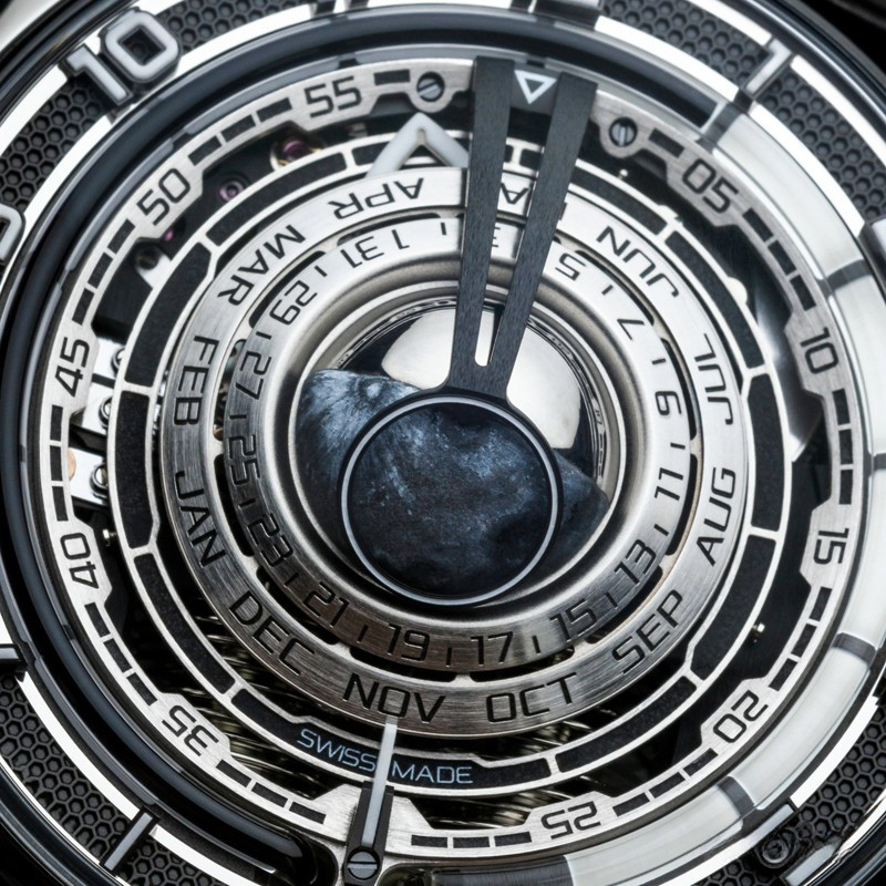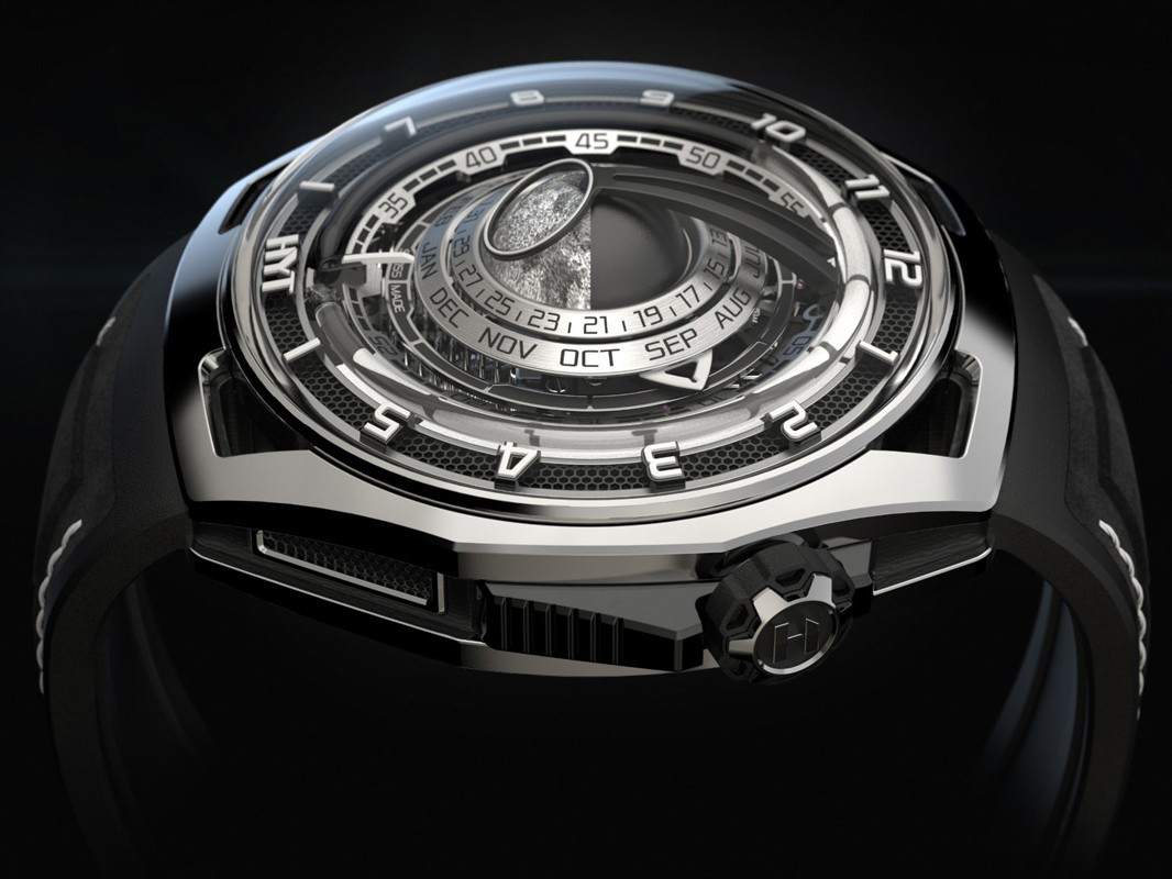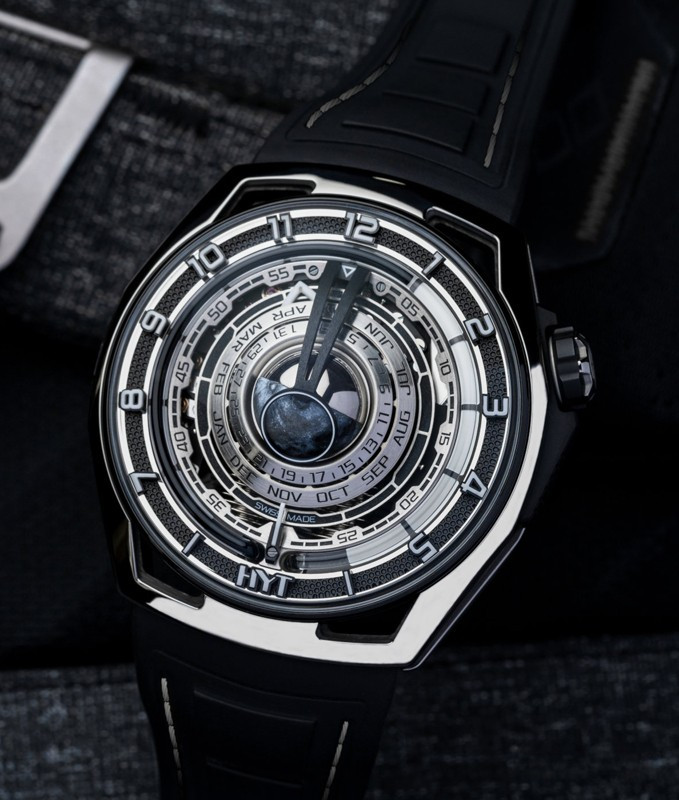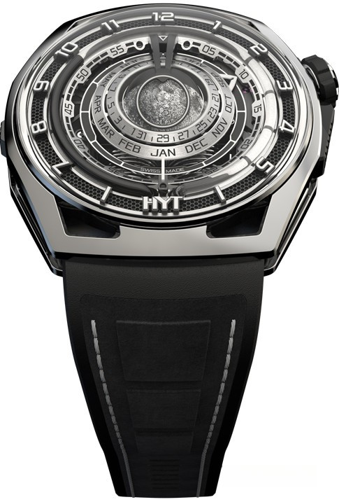 Часы HYT Moon Runner Ghost представлены в корпусе из титана размером 48 х 52.3 х 13.3 мм водонепроницаемостью 30 метров. Внутри корпуса установлен механизм с ручным заводом, Калибр HYT 601-MO, обладающий запасом хода 72 часа. На серебристом циферблате отображаются часы, минуты, дата, месяц, фаза луны. Часы комплектуются каучуковым ремешком с титановой застежкой. Серия ограничена - 15 шт.
