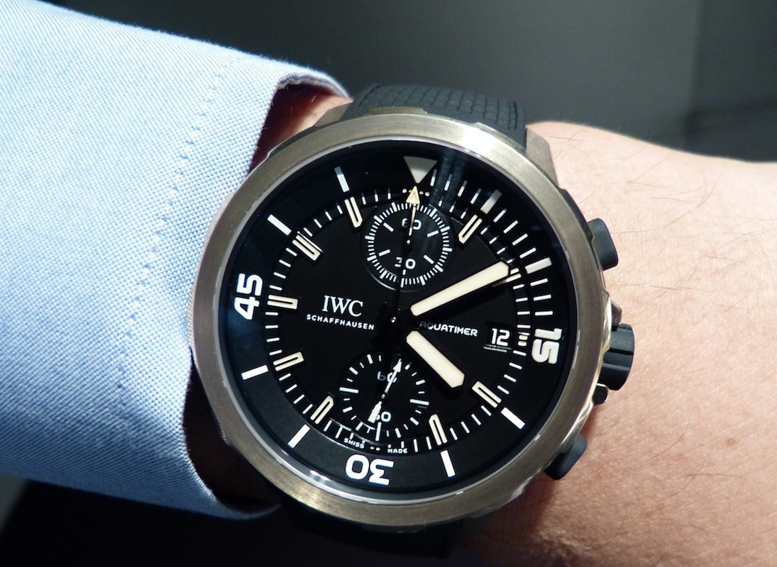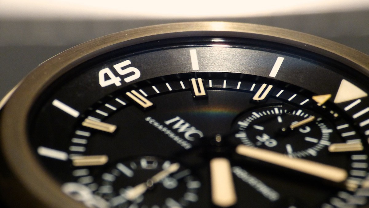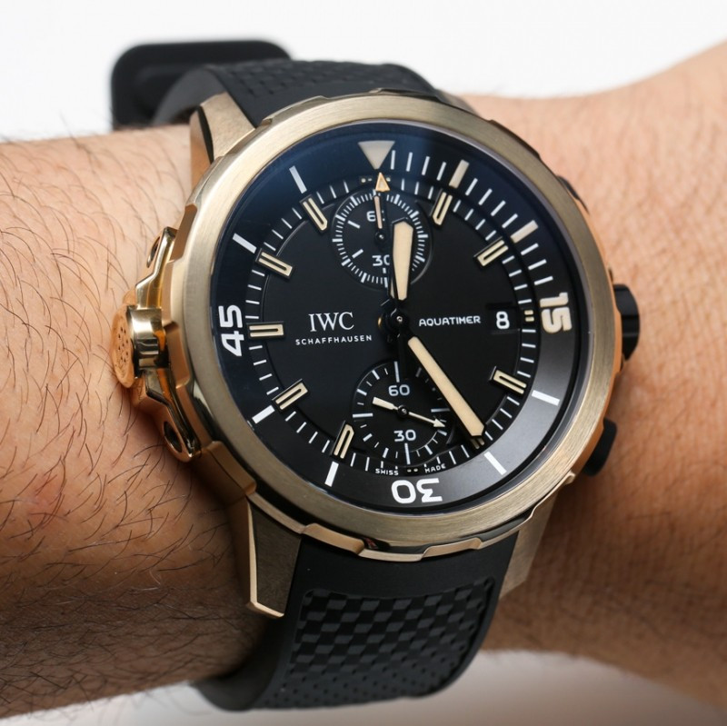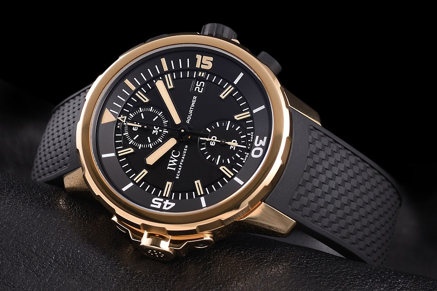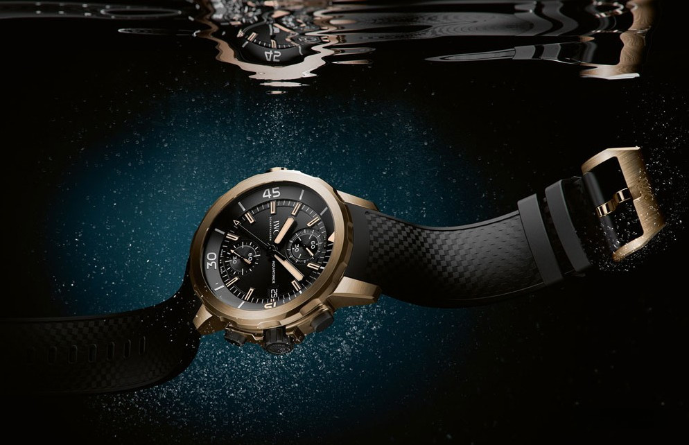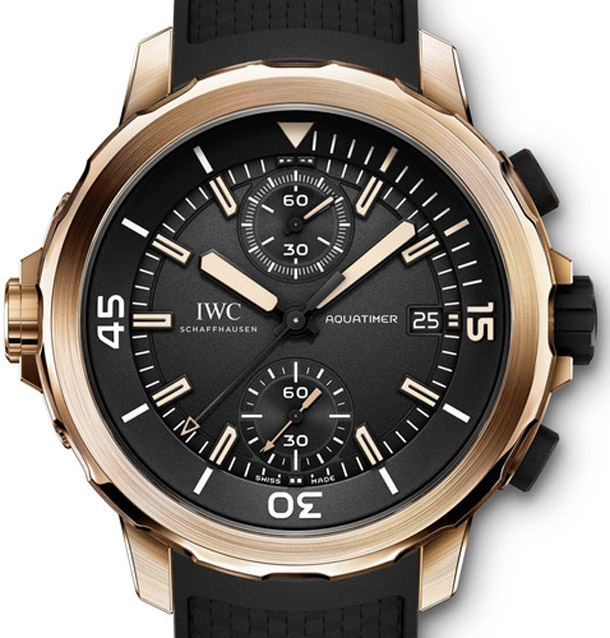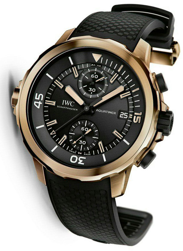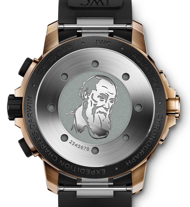 Водостойкие часы из специальной серии IWC Aquatimer Chronograph Charles Darvin Edition IW379503 с хронографом выпущены в круглом корпусе из бронзы и титана. Размер составляет 44 мм, водонепроницаемость 300 м с вращающемся безелем. Внутри корпуса установлен автоматический механизм, Калибр 79320, обеспечивающий запас хода 44 часа. На черном циферблате отображаются часы, минуты, секунды, дата, день недели. Часы комплектуются каучуковым ремешком с бронзовой вставкой.