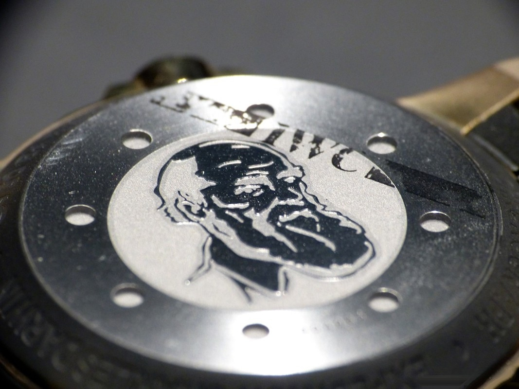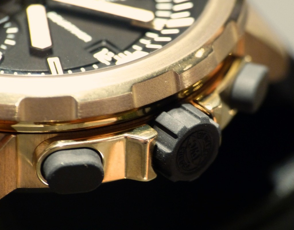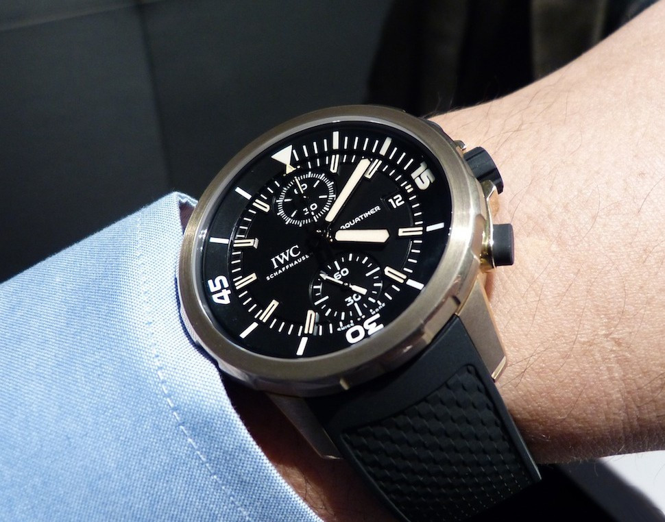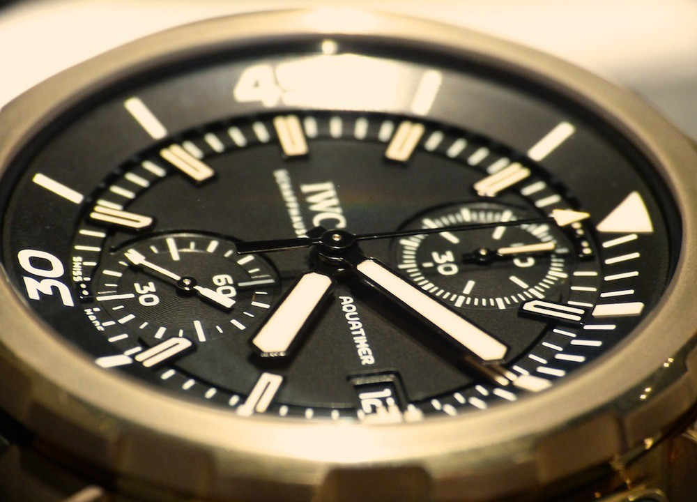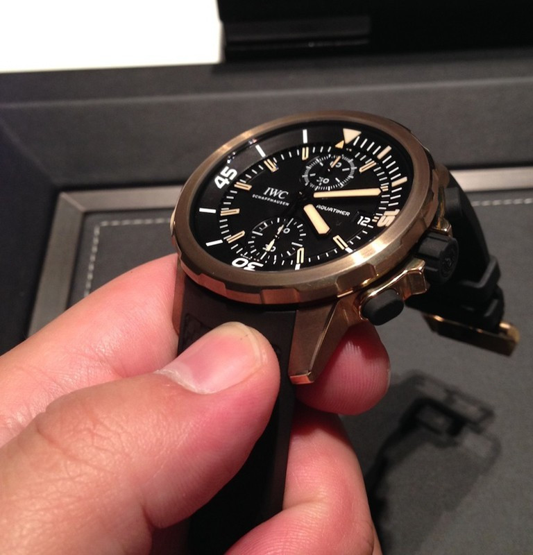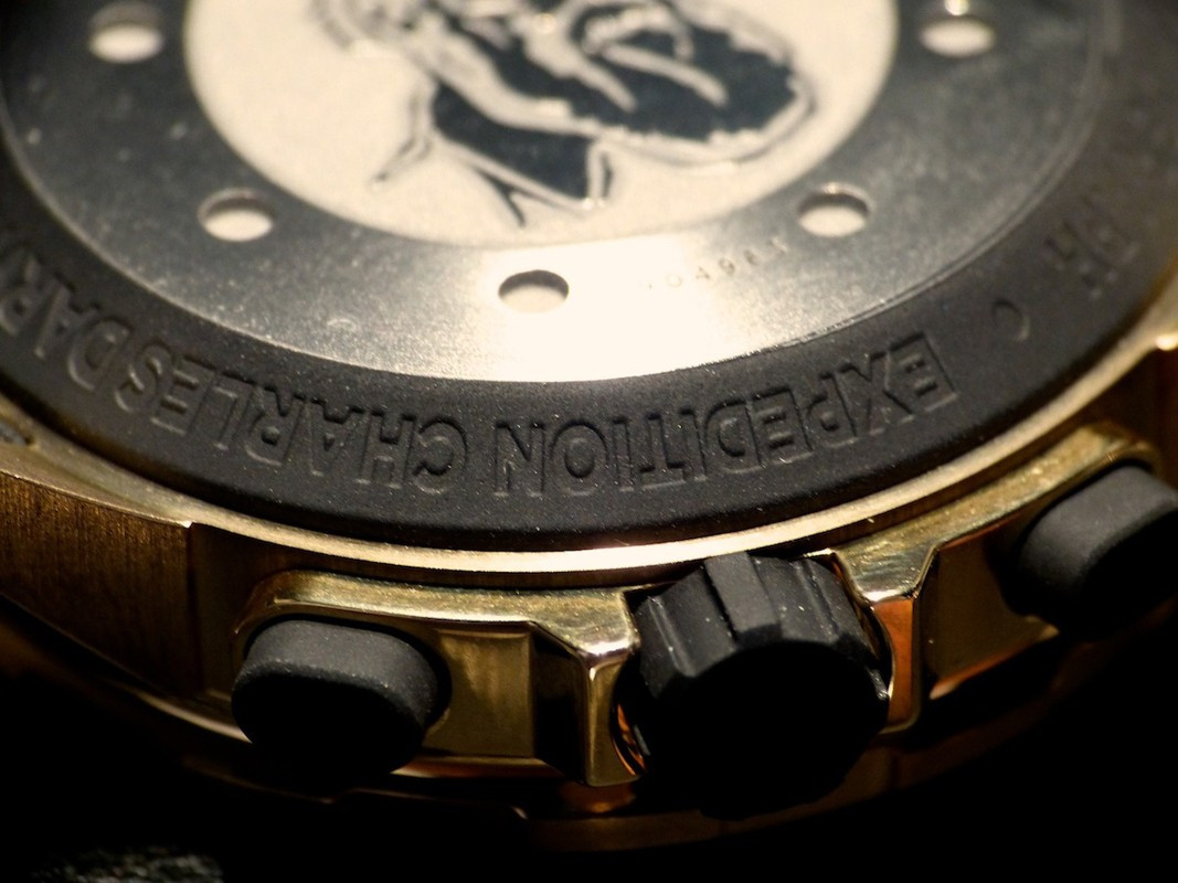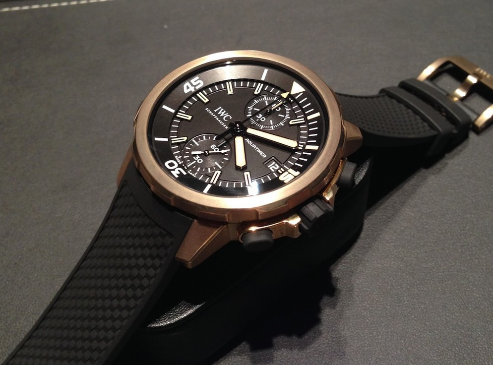 Водостойкие часы из специальной серии IWC Aquatimer Chronograph Charles Darvin Edition IW379503 с хронографом выпущены в круглом корпусе из бронзы и титана. Размер составляет 44 мм, водонепроницаемость 300 м с вращающемся безелем. Внутри корпуса установлен автоматический механизм, Калибр 79320, обеспечивающий запас хода 44 часа. На черном циферблате отображаются часы, минуты, секунды, дата, день недели. Часы комплектуются каучуковым ремешком с бронзовой вставкой.