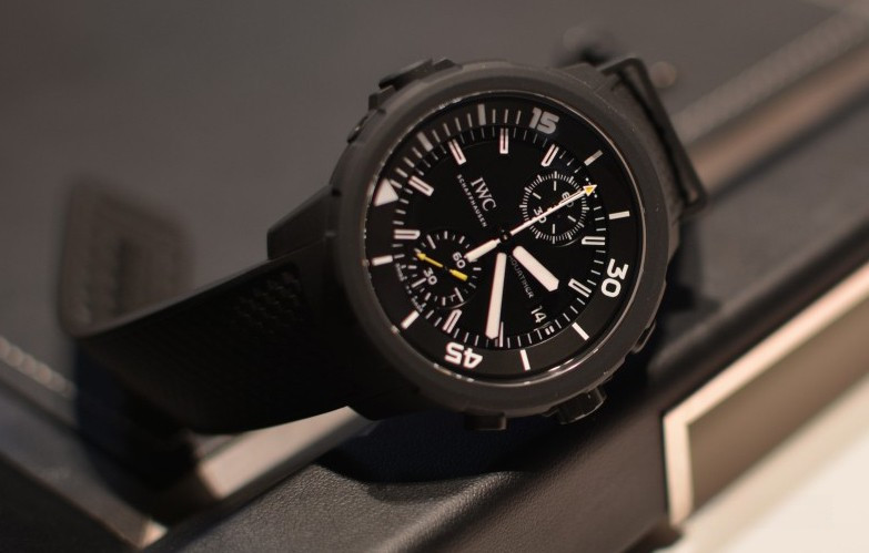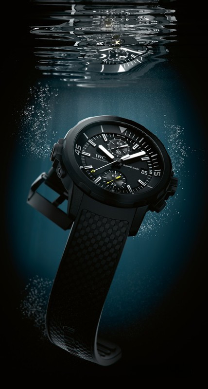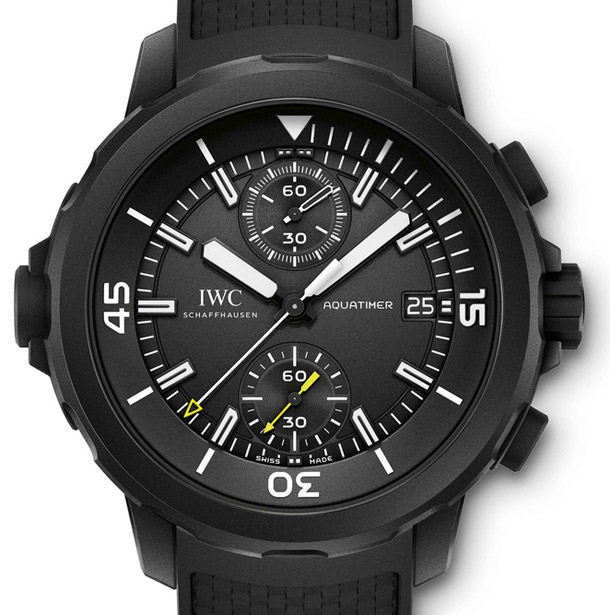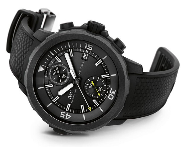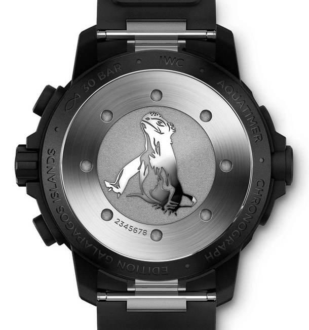 Водостойкие часы из специальной серии IWC Aquatimer Chronograph Edition Galapagos Islands IW379502 с хронографом выпущены в круглом корпусе из нержавеющей стали с покрытием PVD. Размер составляет 44 мм, водонепроницаемость 300 м, часы с вращающемся безелем. Внутри корпуса установлен автоматический механизм, Калибр 79320, обеспечивающий запас хода 44 часа. На черном циферблате отображаются часы, минуты, секунды, дата, день недели. Часы комплектуются каучуковым ремешком с вставкой из нержавеющей стали.