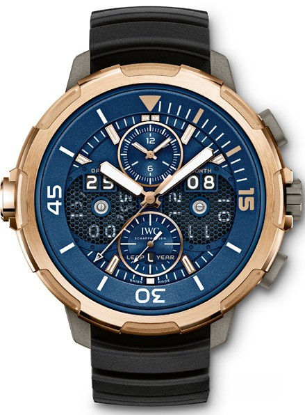Водостойкие часы из специальной серии IWC Aquatimer Perpetual Calendar Digital Date Month с хронографом выпущены в круглом корпусе из титана и розового золота 18к. Размер составляет 49 х 19 мм, водонепроницаемость 100 м, часы с увеличенной датой и вращающимся безелем. Внутри корпуса установлен автоматический механизм, Калибр 89801, обеспечивающий запас хода 68 часов. На синем циферблате отображаются часы, минуты, секунды, дата, день недели, месяц, цикл високосного года. Часы комплектуются каучуковым ремешком с титановой вставкой. Серия ограничена 50 шт.