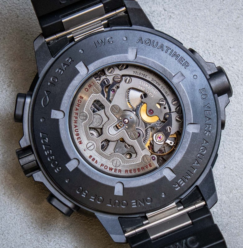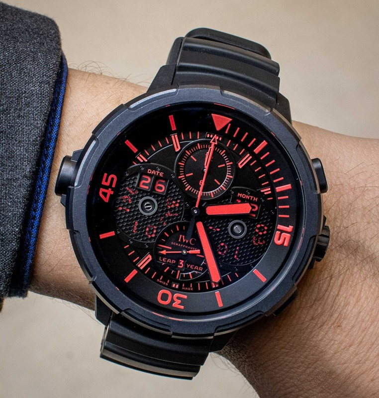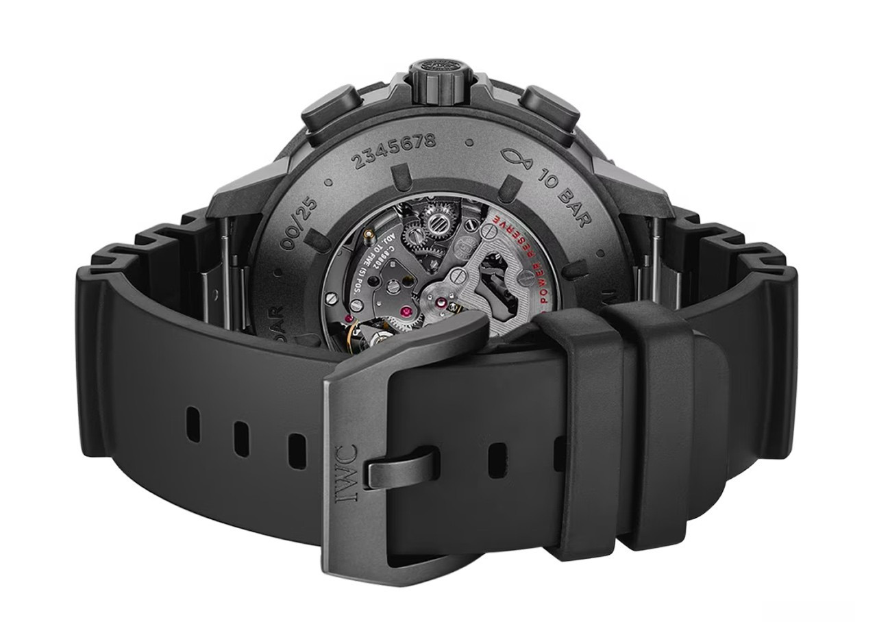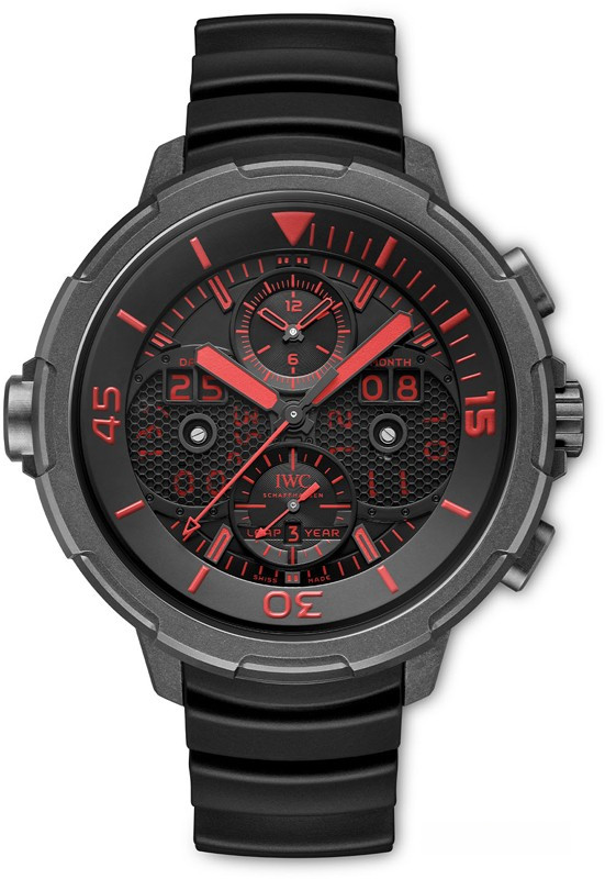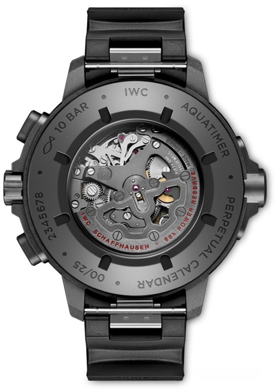 Водостойкие часы из специальной серии IWC Aquatimer Perpetual Calendar Digital Date Month с хронографом выпущены в круглом корпусе из Ceratanium. Размер составляет 49 х 19.5 мм, водонепроницаемость 100 м, часы с увеличенной датой и вращающимся безелем. Внутри корпуса установлен автоматический механизм, Калибр 89802, обеспечивающий запас хода 68 часов. На черном циферблате отображаются часы, минуты, секунды, дата, день недели, месяц, цикл високосного года. Часы комплектуются каучуковым ремешком с застежкой из Ceratanium. Серия ограничена - 25 шт.