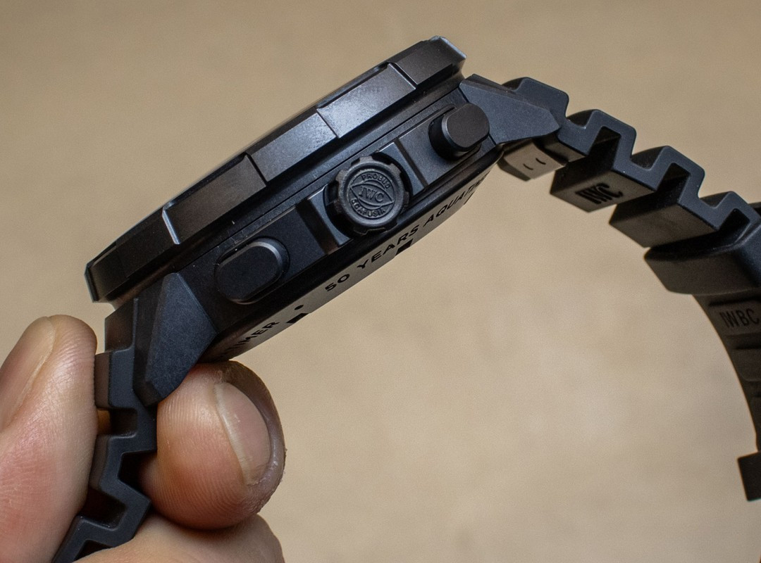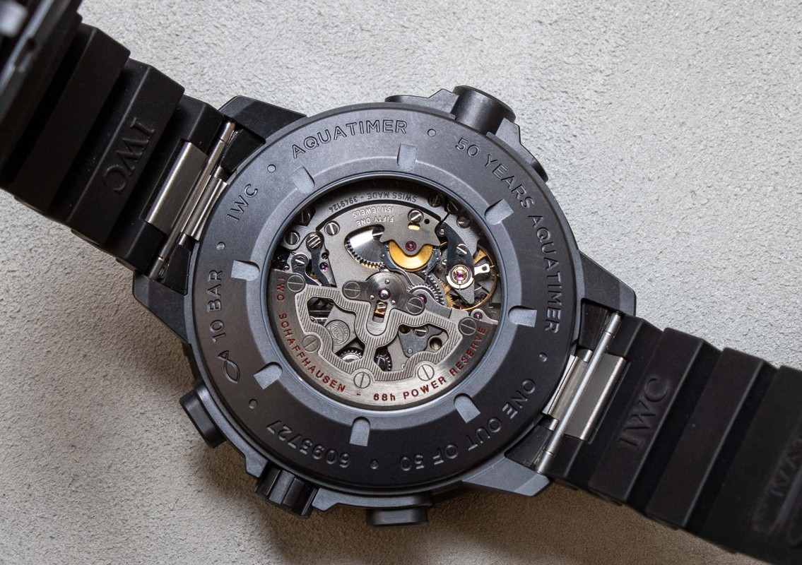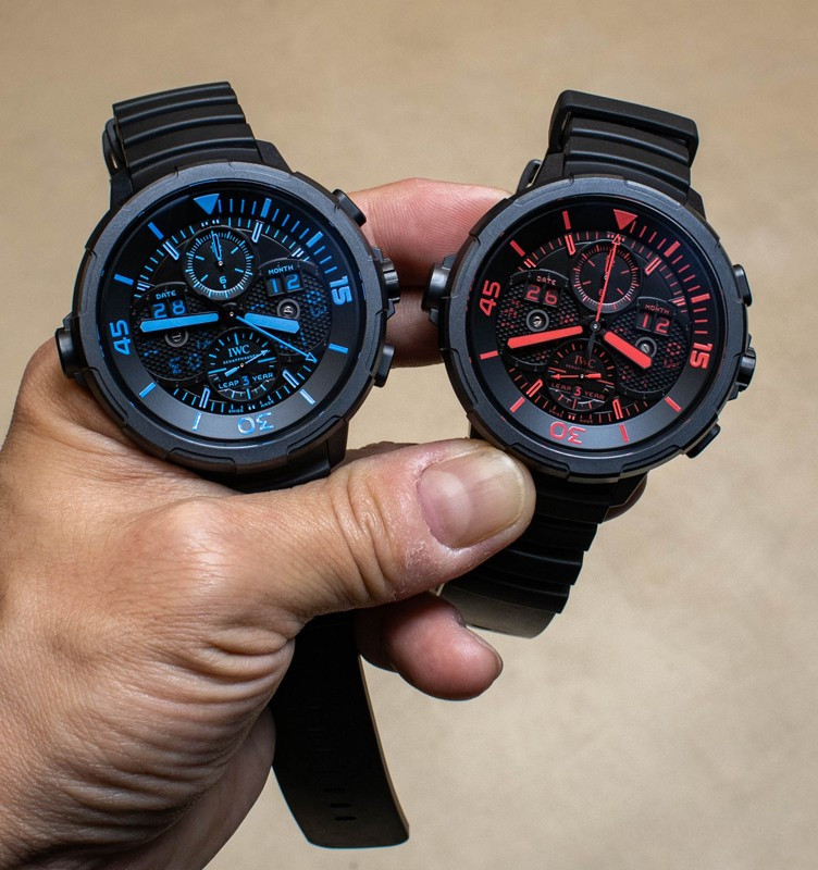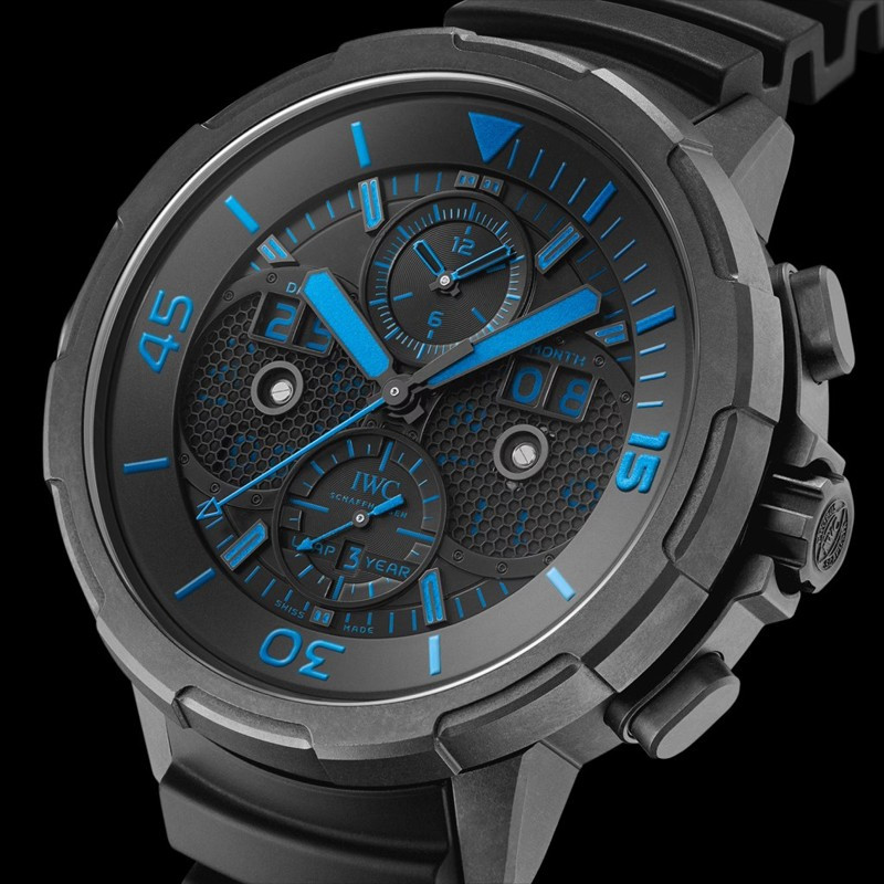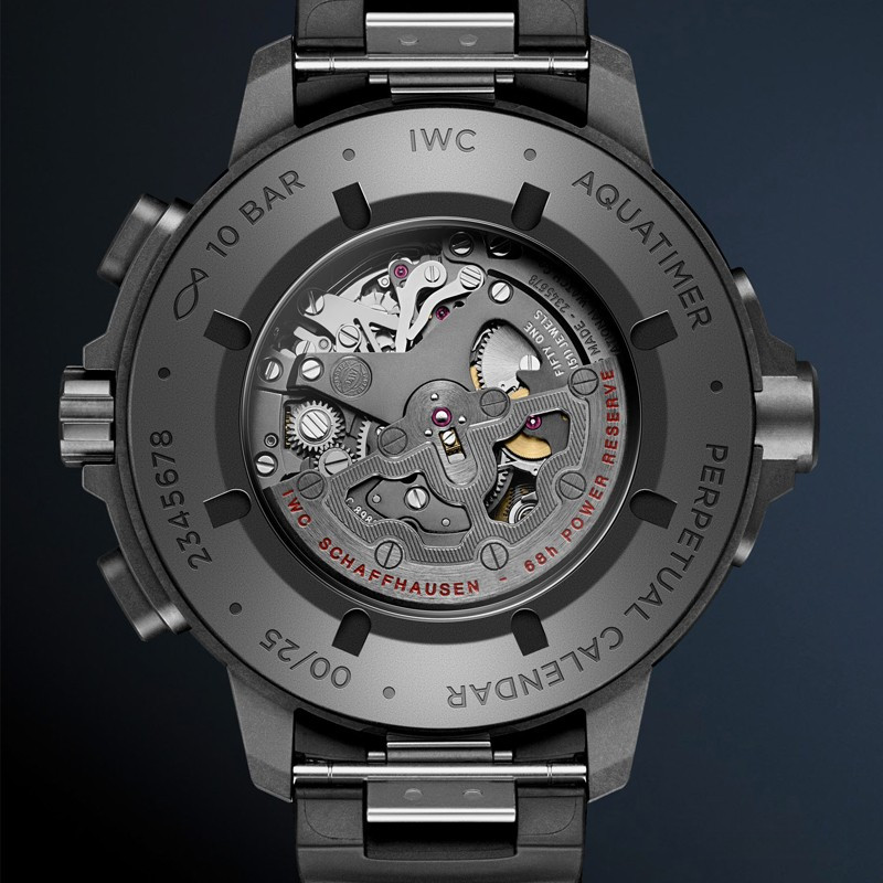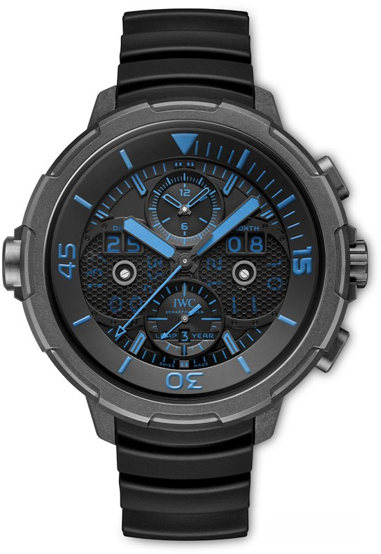Водостойкие часы из специальной серии IWC Aquatimer Perpetual Calendar Digital Date Month с хронографом выпущены в круглом корпусе из Ceratanium. Размер составляет 49 х 19.5 мм, водонепроницаемость 100 м, часы с увеличенной датой и вращающимся безелем. Внутри корпуса установлен автоматический механизм, Калибр 89802, обеспечивающий запас хода 68 часов. На черном циферблате отображаются часы, минуты, секунды, дата, день недели, месяц, цикл високосного года. Часы комплектуются каучуковым ремешком с застежкой из Ceratanium. Серия ограничена - 25 шт.