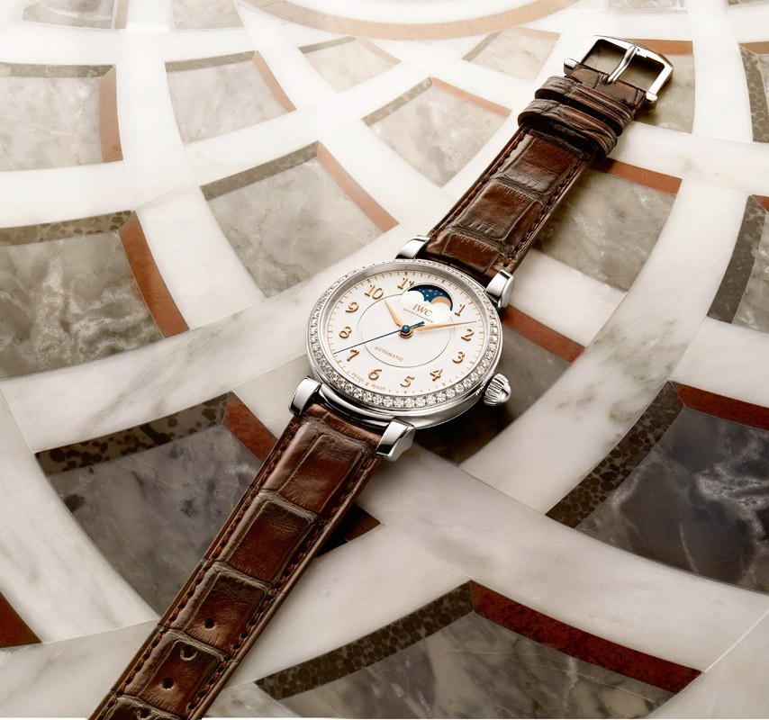 Da Vinci Automatic Moon Phase 36 (Ref. IW459307) - женские часы с круглым полированным корпусом, изготовленным из нержавеющей стали, диаметром 36 мм, водонепроницаемый до 30 метров. Рифленая заводная головка расположена на 3 часах. На завинчивающейся глухой задней крышке часового корпуса выгравировано изображение "Цветка жизни" Леонардо да Винчи. Сапфировое стекло защищает двухуровневый серебристый циферблат с арабскими цифрами и золотыми стрелками. Функции индикации часов, минут, секунд (посредством соответствующих центральных стрелок) и фаз Луны (посредством соответствующего указателя в фигурной апертуре, расположенной на 12 часах). Поставляется на ремешке Santoni из кожи аллигатора с застежкой из нержавеющей стали. Безель из 54-х белых бриллиантов.