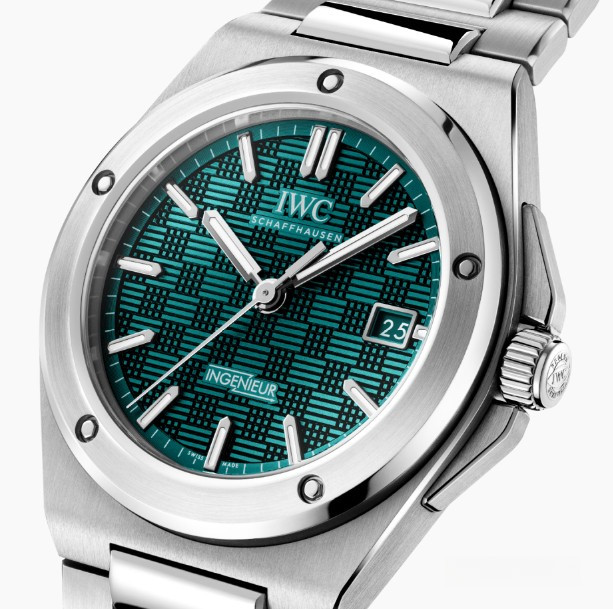 Водостойкие часы IWC Ingenieur Automatic 40 mm выпущены в корпусе из нержавеющей стали. Размер составляет 40 х 10.8 мм, водонепроницаемость 100 м. Внутри корпуса установлен автоматический механизм, Калибр 32111, обеспечивающий запас хода 5 дней. На зеленом гильошированном циферблате отображаются часы, минуты, секунды, дата. Часы комплектуются браслетом из нержавеющей стали.