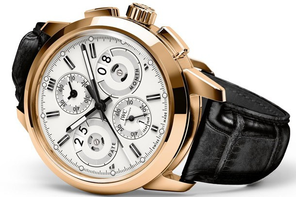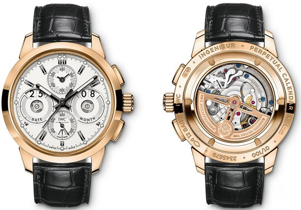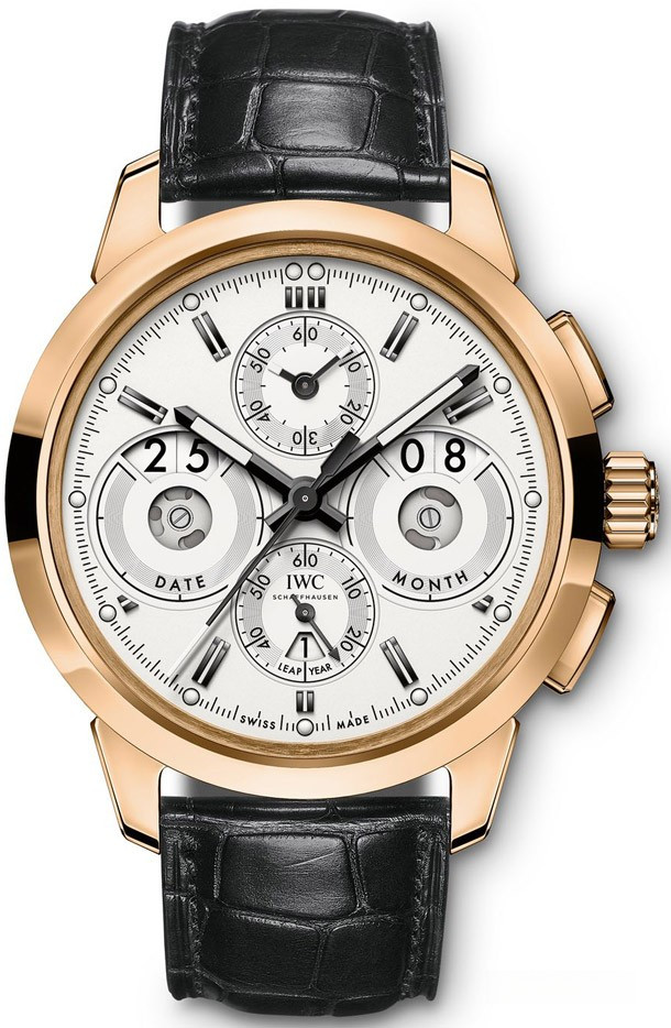 Водостойкие часы IWC Ingenieur Perpetual Calendar Digital Date-Month с двойным временем и хронографом выпущены в круглом корпусе из розового золота 18к. Размер составляет 45 мм, водонепроницаемость 120 м. Внутри корпуса установлен автоматический механизм, Калибр IWC 89800, обеспечивающий запас хода 68 часов. На серебристом циферблате отображаются часы, минуты, секунды, дата, месяц, цикл високосного года. Часы комплектуются ремешком из кожи аллигатоора с вставкой из розового золота 18к.