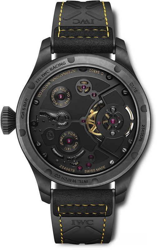 Часы IWC Pilot`s Watches Big Pilot’s Watch Constant-Force Tourbillon Edition “IWC Racing” представлены в корпусе из керамики размером 46.2 x 13.5 мм водонепроницаемостью 100 метров. Внутри корпуса находится механизм с ручным заводом, Калибр 94800, обладающий запасом хода 96 часов. На черном циферблате отображаются часы, минуты, секунды, фаза луны, запас хода. Часы поставляются на каучуковом ремешке с титановой вставкой. Серия ограничена - 15 шт.