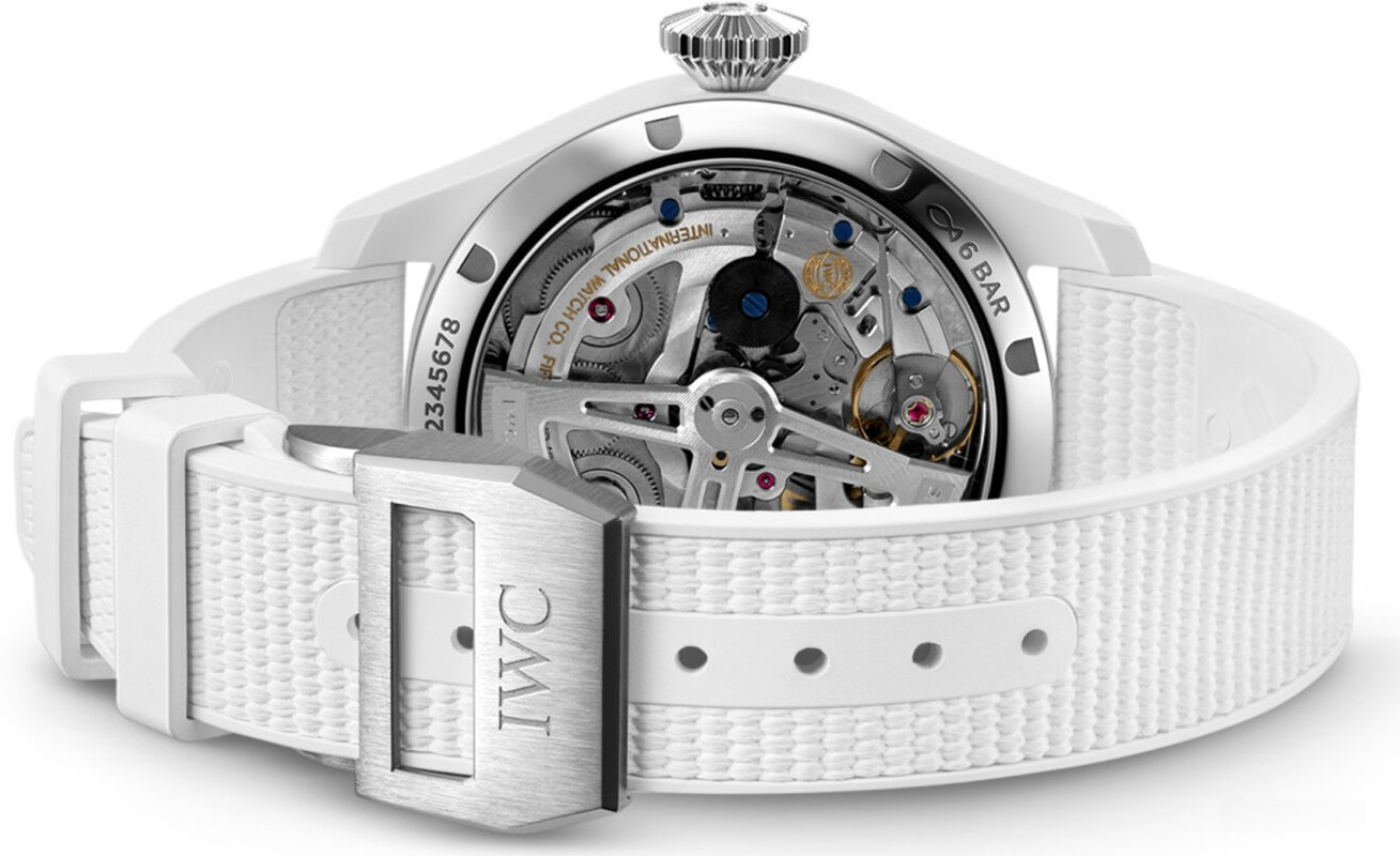 Часы IWC Pilot`s Watches Big Pilot’s Watch Perpetual Calendar Top Gun представлены в корпусе из керамики размером 46.5 х 15.6 мм водонепроницаемостью 60 метров. Внутри корпуса находится автоматический механизм, Калибр IWC 52615, обладающий запасом хода 7 дней. На черном циферблате отображаются часы, минуты, секунды, дата, день недели, месяц, год, запас хода, фаза луны.Часы поставляются на каучуковом ремешке с титановой застежкой.
