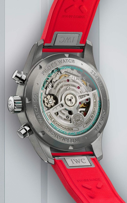 Часы IWC Chronograph 41 Mercedes-AMG Petronas F1 Team представлены в корпусе из титана размером 41 х 14.5 мм водонепроницаемостью 100 метров. Внутри корпуса установлен автоматический механизм, Калибр 69385, обладающий запасом хода 46 часов. На черном циферблате отображаются часы, минуты, секунды, дата, день недели. Часы комплектуются каучуковым ремешком с титановой застежкой.