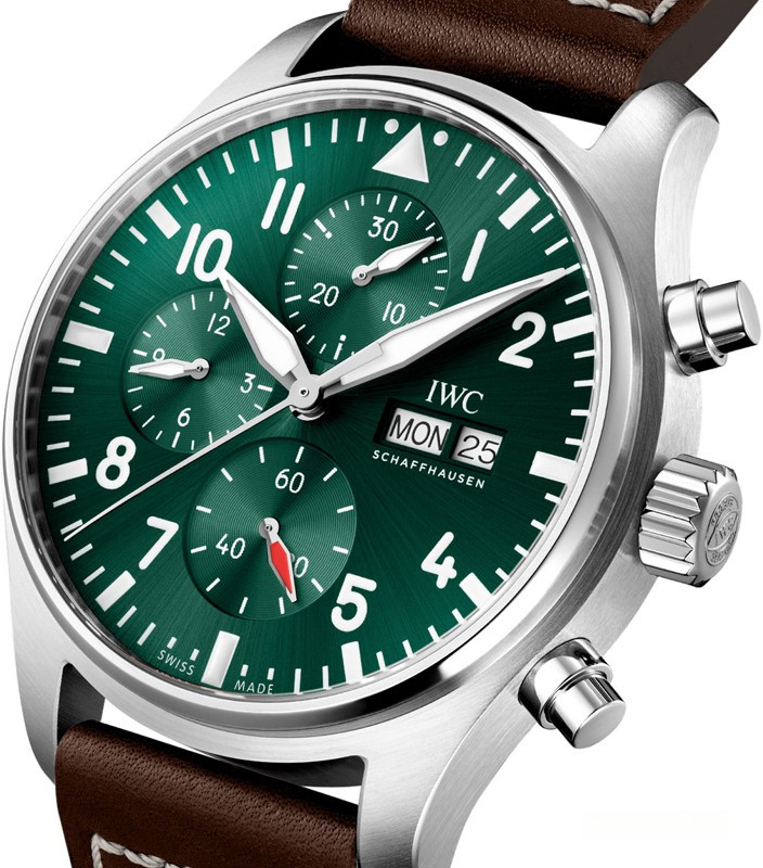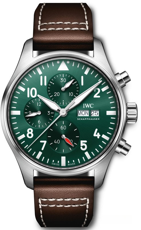 Часы IWC Pilot`s Watches Chronograph 43 mm представлены в корпусе из нержавеющей стали размером 43 х 14.8 мм водонепроницаемостью 100 метров. Внутри корпуса установлен автоматический механизм, Калибр 69385, обладающий запасом хода 46 часов. На зеленом циферблате отображаются часы, минуты, секунды, дата, день недели. Часы поставляются на кожаном ремешке с застежкой из нержавеющей стали.