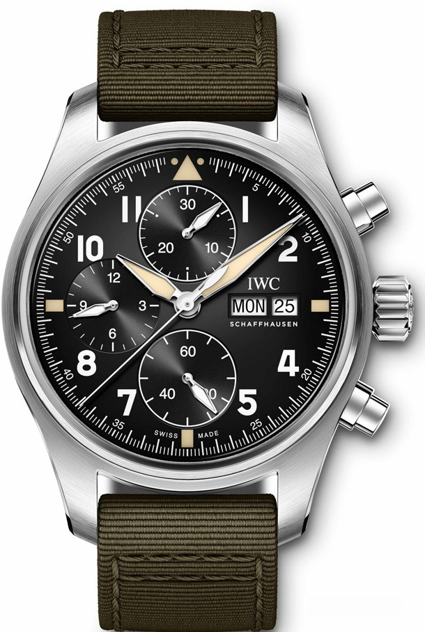 Часы Pilot’s Watch Chronograph Spitfire IW387901 – ключевая модель новой линейки Spitfire. Источником вдохновения при разработке дизайна послужили легендарные штурманские часы Mark 11, с 1948 года выпускаемые в Шаффхаузене для Королевских ВВС Великобритании. IWC представляет первый хронограф Pilot’s Watch Chronograph с механизмом из семейства калибра 69000 и корпусом уменьшенного формата диаметром всего 41 миллиметр. Корпус из нержавеющей стали, циферблат черного цвета и текстильный ремешок определяют уникальный характер модели.