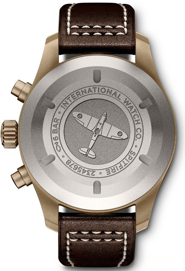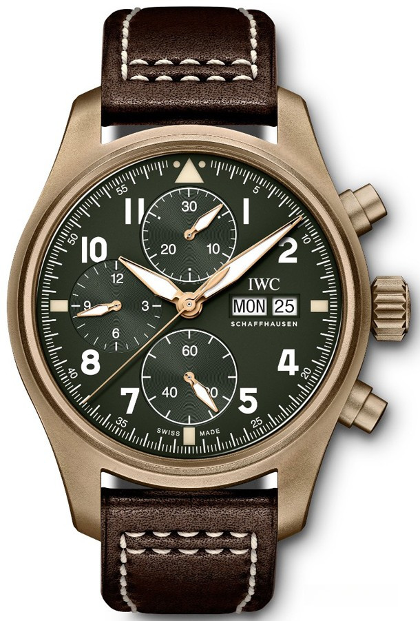 Часы Pilot’s Watch Chronograph Spitfire IW387902 – ключевая модель новой линейки Spitfire. Источником вдохновения при разработке дизайна послужили легендарные штурманские часы Mark 11, с 1948 года выпускаемые в Шаффхаузене для Королевских ВВС Великобритании. IWC представляет первый хронограф Pilot’s Watch Chronograph с механизмом из семейства калибра 69000 и корпусом уменьшенного формата диаметром всего 41 миллиметр. Корпус из бронзы, циферблат оливково-зеленого цвета и коричневый ремешок из телячьей кожи определяют уникальный характер модели. Со временем бронза покрывается характерной патиной, что превращает каждый экземпляр в уникальное изделие.