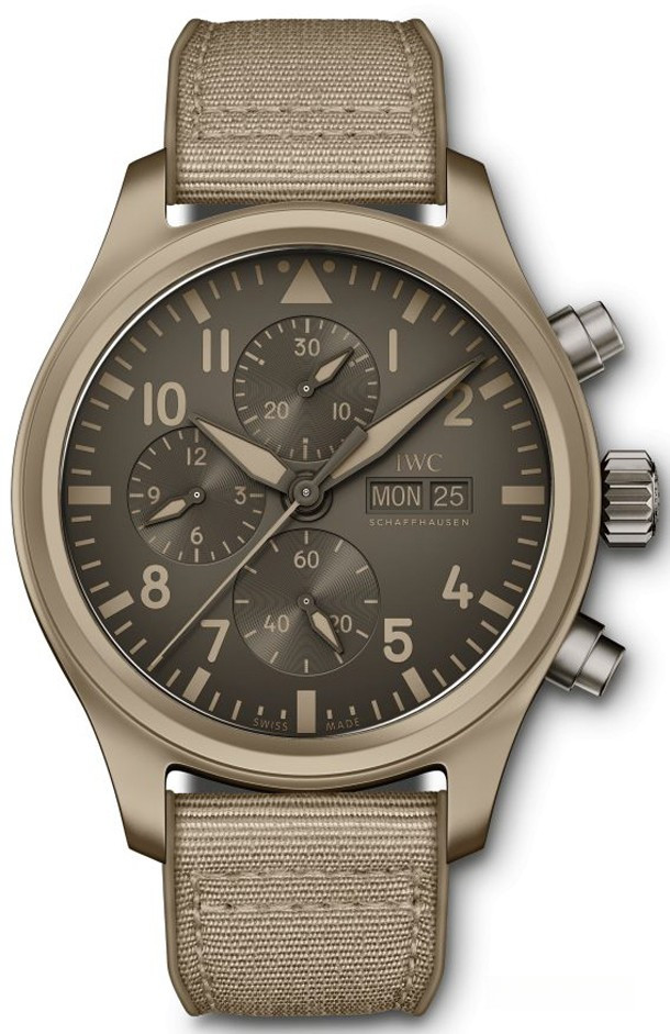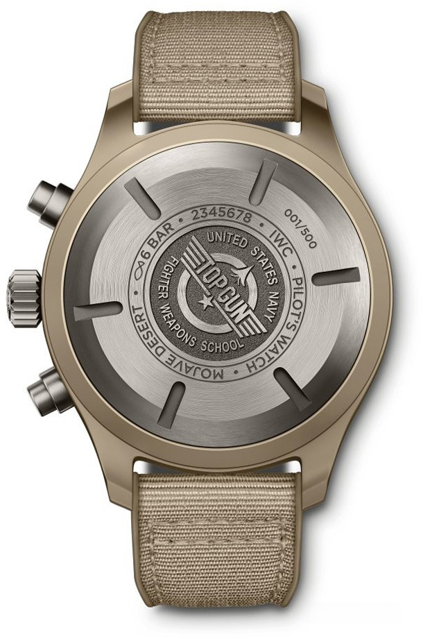 Песочный цвет керамики символизирует пустыню Мохаве, где расположена крупнейшая наземная авиабаза ВМС США «Чайна-Лейк». Цвет, который идеально сочетается с формой пилотов ВМС, был получен в результате смешения оксида циркония с другими оксидами металлов. Хронограф, выпущенный лимитированной серией из 500 экземпляров, оснащен мануфактурным Калибром 69380 производства IWC. Помимо функции хронографа механизм с классической конструкцией колонного колеса имеет также указатели даты и дня недели. Двунаправленный механизм автоматического подзавода с собачками обеспечивает 46-часовой запас хода. Хронограф с темно-коричневым циферблатом предлагается с текстильным ремешком песочного цвета.