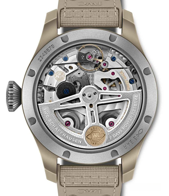 Часы IWC Pilot`s Watches Perpetual Calendar Top Gun Edition Mojave Desert представлены в корпусе из керамики размером 46.5 х 15.6 мм водонепроницаемостью 60 метров. Внутри корпуса находится автоматический механизм, Калибр IWC 52615, обладающий запасом хода 60 часов. На коричневом циферблате отображаются часы, минуты, секунды, дата, день недели, месяц, фаза луны, год, запас хода. Часы поставляются на текстильном ремешке с вставкой из нержавеющей стали. Серия ограничена - 150 шт.