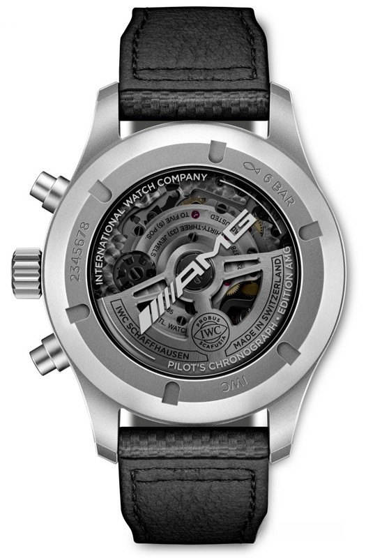 Часы IWC Pilot’s Watch Chronograph Edition “AMG” представлены в корпусе из титана размером 43 х 14.8 мм водонепроницаемостью 60 метров. Внутри корпуса находится автоматический механизм, Калибр 69385, обладающий запасом хода 46 часов. На черном карбоновом циферблате отображаются часы, минуты, секунды, дата, день недели, накопители хронографа. Часы поставляются на кожаном ремешке с вставкой из титана.