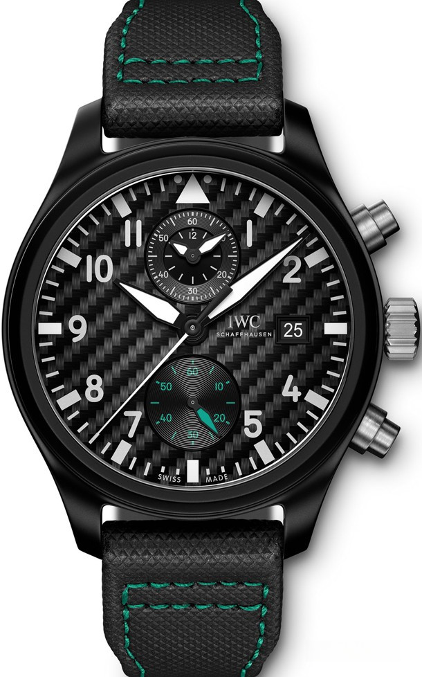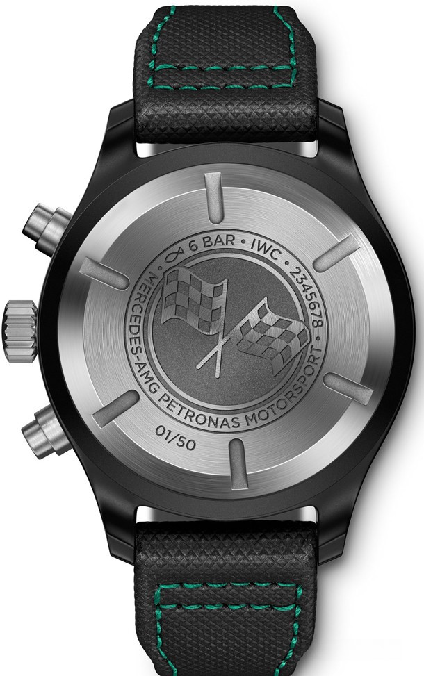 Pilot’s Watch Chronograph Edition “Mercedes-AMG Petronas Motorsport” (реф. IW389005) выпущены ограниченной серией 50 штук. Часы представлены в черном керамическом корпусе с черным циферблатом из углеродного волокна. Маленькая секундная стрелка расположена на 6-ти часах. Зеленые цифры сочетаются с цветом нити на простроченном черном ремешке из телячьей кожи и выполнены в командном цвете PETRONAS Emerald Green. Калибр 89361, выпущенный IWC, показывает часы и минуты на дополнительном циферблате на отметке 12-ти часов. Функция возврата хронографа простым нажатием кнопки сброса позволяет мгновенно начать отсчет времени. Эта функция также используется на гоночной трассе для определения самого быстрого времени круга.