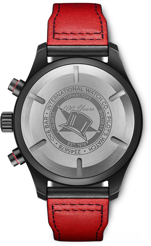 Часы IWC Pilot’s Watch Chronograph Edition “Tophatters” представлены в корпусе из керамики размером 44.5 х 15.7 мм водонепроницаемостью 60 метров. Внутри корпуса находится автоматический механизм, Калибр 69380, обладающий запасом хода 46 часов. На черном циферблате отображаются часы, минуты, секунды, дата, день недели. Часы поставляются на кожаном ремешке с титановой вставкой. Серия ограничена - 500 шт.
