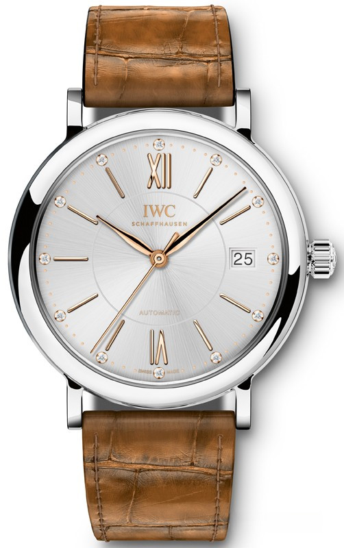 Женские часы IWC Portofino Midsize Automatic выпущены в корпусе из нержавеющей стали рамером 37 х 9 мм и водонепроницаемостю до 30 метров. На серебристом циферблате расположены 12 белых бриллиантов в качестве часовых метов, а также золотые накладные римские цифры и шевроны. Часы, минуты и секунды отображаются на циферблате поседством центральных стрелок, апертура даты расположена на 3-х часах. Внутри корпуса установлен автоматический механизм 35111 с запасом хода 42 часа. Сапфировое стекло с антибликовым покрытием установлено с двух сторон корпуса. Часы комплектуются коричневым ремешком из кожи аллигатора с застежкой из нержавеющей стали.