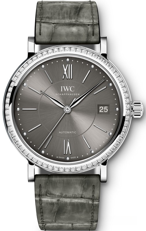Женские часы IWC Portofino Midsize Automatic выпущены в корпусе из нержавеющей стали рамером 37 х 9 мм и водонепроницаемостю до 30 метров. На сером циферблате расположены накладные римские цифры и шевроны. Часы, минуты и секунды отображаются на циферблате поседством центральных стрелок, апертура даты расположена на 3-х часах. Внутри корпуса установлен автоматический механизм 35111 с запасом хода 42 часа. Сапфировое стекло с антибликовым покрытием установлено с двух сторон корпуса. Безель из 66-ти белых бриллиантов. Часы комплектуются серым ремешком из кожи аллигатора с застежкой из нержавеющей стали.