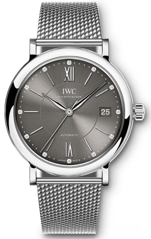 Женские часы IWC Portofino Midsize Automatic выпущены в корпусе из нержавеющей стали рамером 37 х 9 мм и водонепроницаемостю до 30 метров. На сером циферблате расположены 12 белых бриллиантоа в качестве часовых меток и накладные римские цифры и шевроны. Часы, минуты и секунды отображаются на циферблате поседством центральных стрелок, апертура даты расположена на 3-х часах. Внутри корпуса установлен автоматический механизм 35111 с запасом хода 42 часа. Сапфировое стекло с антибликовым покрытием установлено с двух сторон корпуса. Часы комплектуются браслетом из нержавеющей стали.