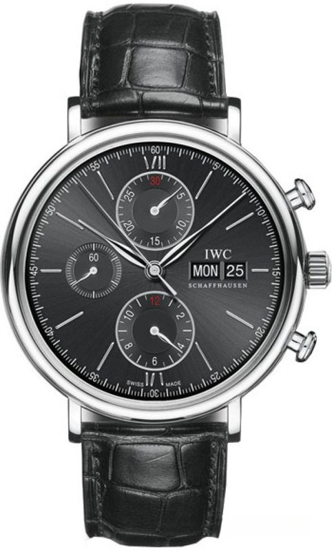 Часы с хронографом IWC Portofino Chronograph IW391008 выпущены в круглом корпусе из нержавеющей стали. Размер составляет 42 х 13,5 мм, водонепроницаемость 30 м. Внутри корпуса установлен автоматический механизм, Калибр 79320, обеспечивающий запас хода 44 часа. На черном циферблате отображаются часы, минуты, секунды, дата, день недели. Часы комплектуются ремешком из кожи аллигатора с вставкой из нержавеющей стали.