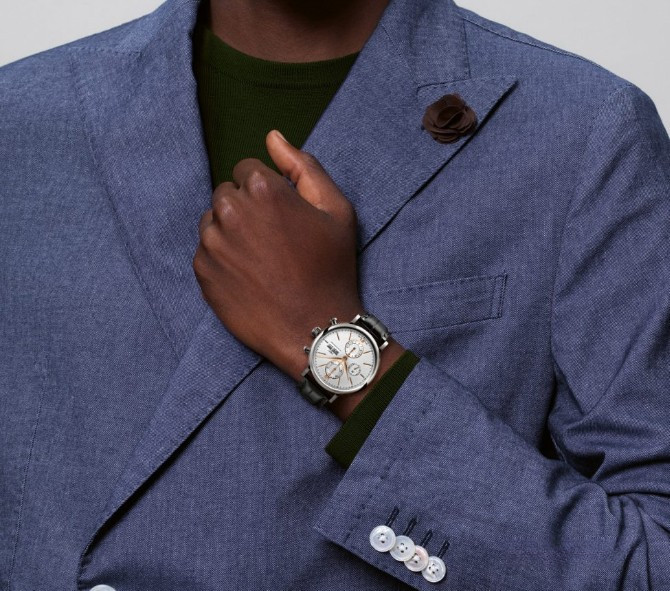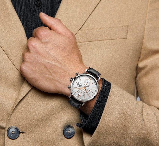 Элегантно спортивный дизайн кнопок и счетчиков хронографа Portofino Chronograph напоминает стиль 1960-х годов. Корпус выполнен из нержавеющей стали. Посеребренный циферблат с накладными римскими цифрами защищен выпуклым сапфировым стеклом. Надежный калибр 75320 с автоподзаводом обеспечивает 44-часовой запас хода. В комплекте к часам идет черный ремешок из кожи аллигатора.