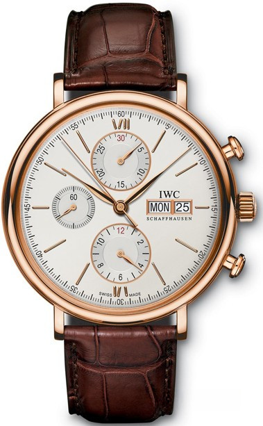 Часы с хронографом IWC Portofino Chronograph IW391020 выпущены в круглом корпусе из розового золота 18к. Размер составляет 42 х 13,5 мм, водонепроницаемость 30 м. Внутри корпуса установлен автоматический механизм, Калибр 79320, обеспечивающий запас хода 44 часа. На серебристом циферблате отображаются часы, минуты, секунды, дата, день недели. Часы комплектуются коричневым ремешком из кожи аллигатора с вставкой из розового золота 18к.