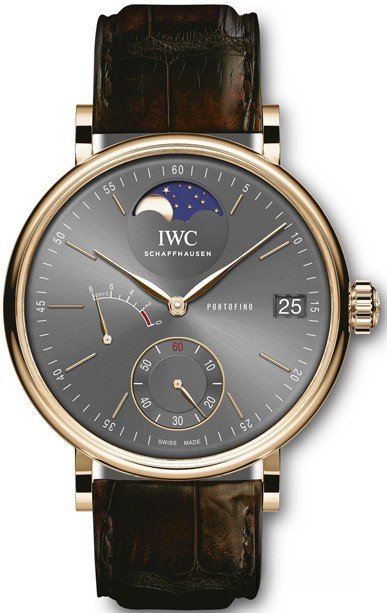 Часы Portofino Hand-Wound Moon Phase представлены в корпусе из розового золота 18к с серым циферблатом. Модель дополняется коричневыми ремешками Santoni из кожи аллигатора. Инженеры швейцарской мануфактуры IWC разработали калибр 59800 с ручным заводом, дополнив семейство Portofino часами с указателем фаз Луны. Указатель настраивается с помощью заводной головки, а его погрешность составляет всего одни сутки за 133 года. Полностью заведенный часовой механизм продолжает работать 192 часа, после чего автоматически останавливается. Индикатор запаса хода в положении «9 часов» показывает оставшееся количество энергии, причем два последних дня выделены красным цветом. Платины и мосты украшены узором «женевские волны» и круговым зернением, открывая вид на сложную колесную передачу.