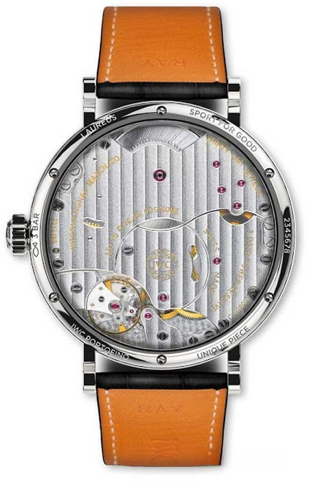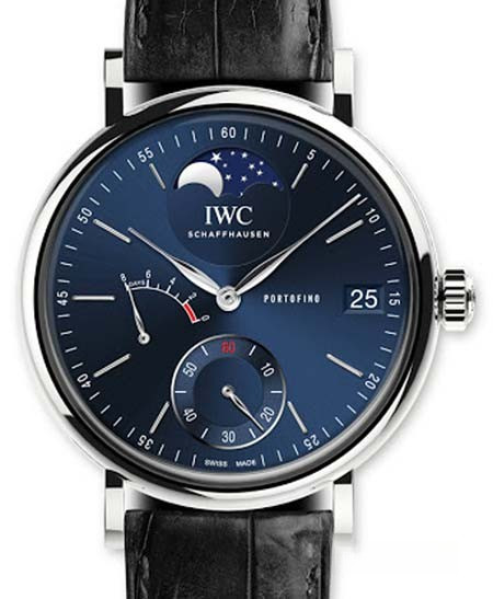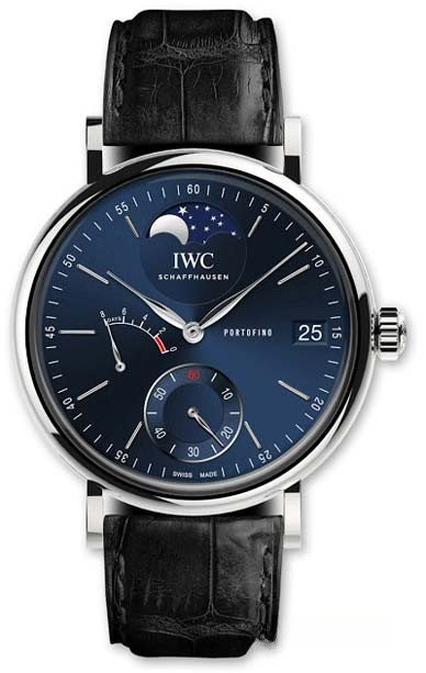 Часы Portofino Hand-Wound Moon Phase представлены в корпусе из нержавеющей стали с синим циферблатом. Модель дополняется черным ремешком Santoni из кожи аллигатора. Инженеры швейцарской мануфактуры IWC разработали калибр 59800 с ручным заводом, дополнив семейство Portofino часами с указателем фаз Луны. Указатель настраивается с помощью заводной головки, а его погрешность составляет всего одни сутки за 133 года. Полностью заведенный часовой механизм продолжает работать 192 часа, после чего автоматически останавливается. Индикатор запаса хода в положении «9 часов» показывает оставшееся количество энергии, причем два последних дня выделены красным цветом. Платины и мосты украшены узором «женевские волны» и круговым зернением, открывая вид на сложную колесную передачу.