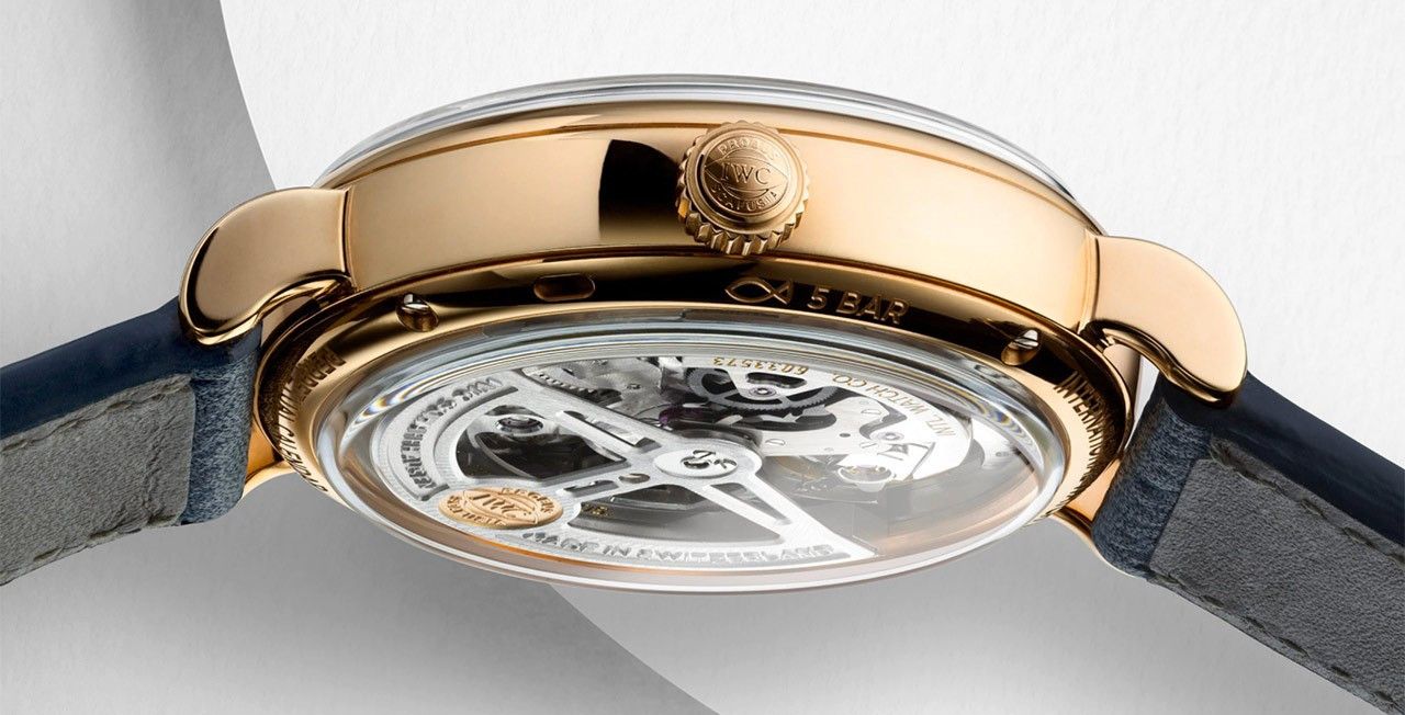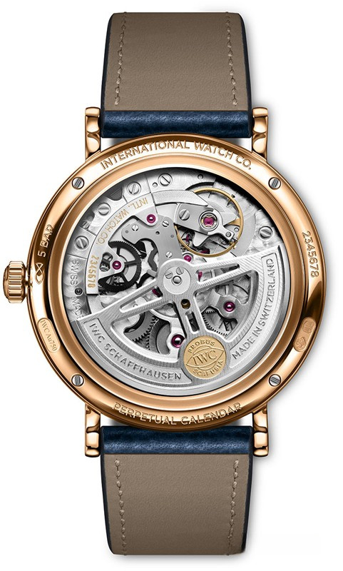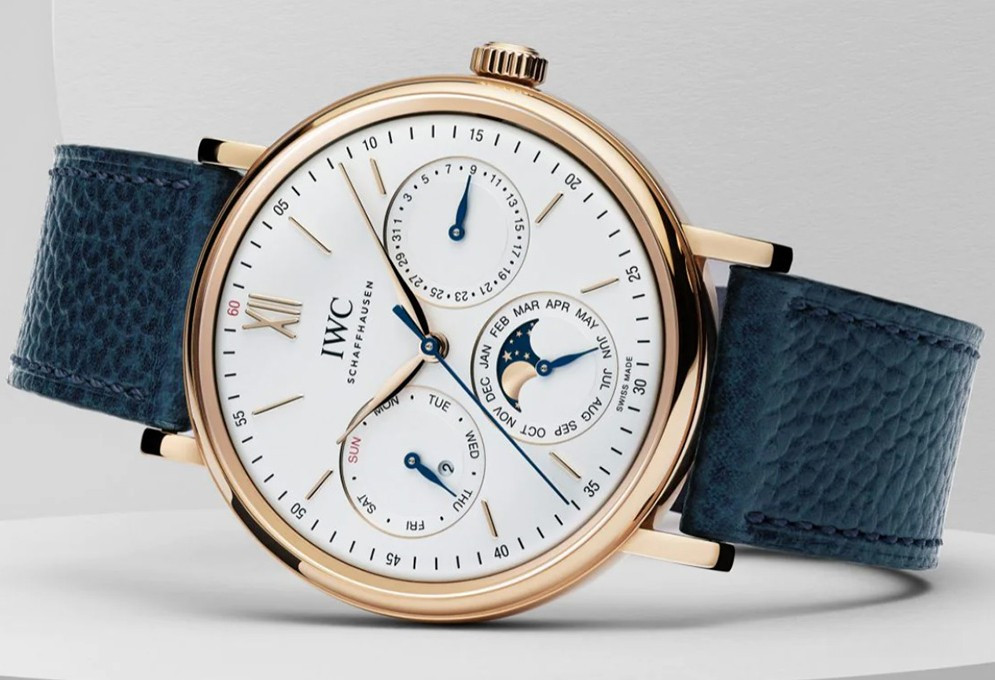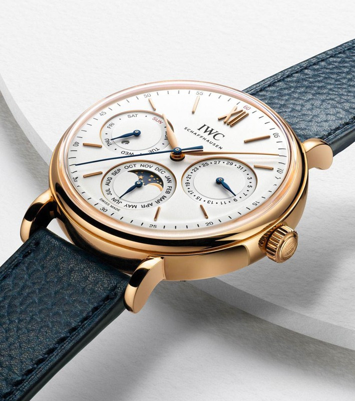 Часы IWC Portofino Perpetual Calendar представлены в корпусе размером 40 х 12.7 мм из розового золота 18к водонепроницаемостью 50 метров. Внутри корпуса установлен автоматический механизм, Калибр 82650, обладающий запасом хода 60 часов. На серебристом циферблате отображаются часы, минуты, секунды, дата, день недели, месяц, фаза луны, цикл високосного года. Часы поставляются на кожаном ремешке с золотой застежкой.