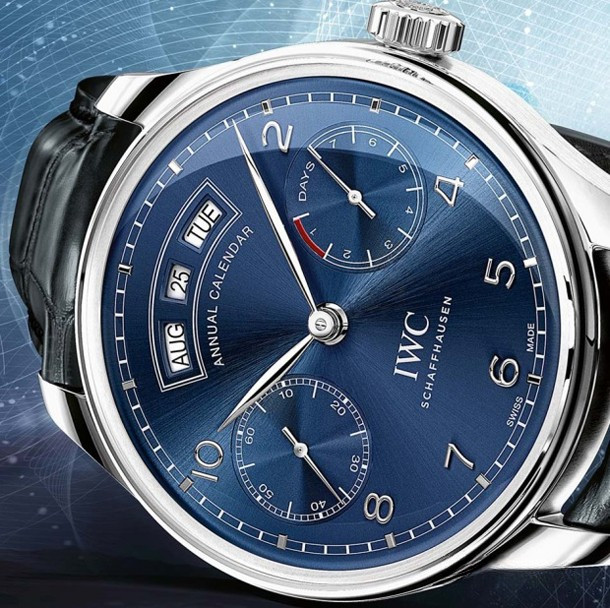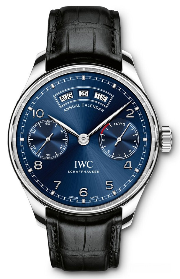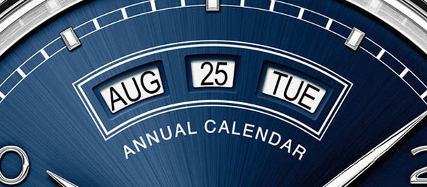 Новое усложнение – годовой календарь – представляет собой гармоничный союз вечного календаря и указателя даты. Мануфактурный калибр IWC 52850, благодаря силе двух заводных барабанов, аккумулирует достаточное количество энергии для работы сложных часовых функций и обеспечения 7-дневного запаса хода. Годовой календарь IWC, расположенный на циферблате около отметки «12 часов», показывает месяц, дату и день недели в трех отдельных полукруглых окошках. Модель выпускается в корпусе из нержавеющей стали с синим циферблатом. Часы дополнены черным ремешком Santoni из кожи аллигатора. Сапфировое стекло с изогнутыми краями визуально уменьшает пропорции часов и подчеркивает их классическую элегантность. Округлые крепления ремешка обеспечивают комфорт при ношении даже владельцам с узким запястьем. Прозрачная крышка из сапфирового стекла открывает детальный вид на прекрасный новый мануфактурный калибр 52850. Невозможно не заметить результат модернизации системы подзавода Пеллатона, детали которой практически не поддаются износу и выполнены из черной и белой керамики.