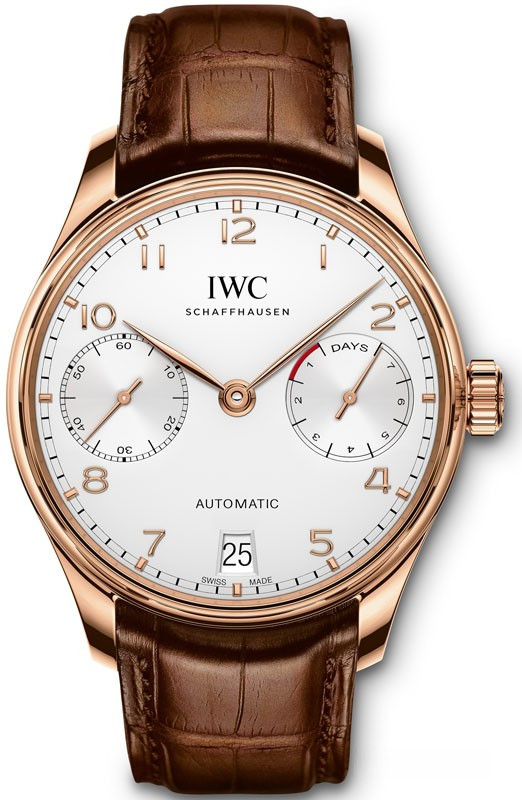 IWC Portugieser Automatic выпущены в корпусе из розового золота 18к. Размер корпуса составляет 42.3 х 14.5 мм. Сапфировое стекло покрыто двусторонним антибликовым покрытием. На серебристом циферблате расположены центральные часовая и минутная стрелки, индикатор запаса хода на 3-х часах, апертура даты на 6-ти часах, малая секундная стрелка на 9-ти часах. Внутри корпуса установлен автоматический механизм IWC 52010 с запасом хода 7 дней. Корпус часов водонепроницаем до 30 метров. Часы комплектуются коричневым ремешком из кожи аллигатора с застежкой из розового золота 18к.