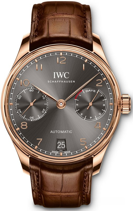 IWC Portugieser Automatic выпущены в корпусе из розового золота 18к. Размер корпуса составляет 42.3 х 14.5 мм. Сапфировое стекло покрыто двусторонним антибликовым покрытием. На сером циферблате расположены центральные часовая и минутная стрелки, индикатор запаса хода на 3-х часах, апертура даты на 6-ти часах, малая секундная стрелка на 9-ти часах. Внутри корпуса установлен автоматический механизм IWC 52010 с запасом хода 7 дней. Корпус часов водонепроницаем до 30 метров. Часы комплектуются коричневым ремешком из кожи аллигатора с застежкой из розового золота 18к.