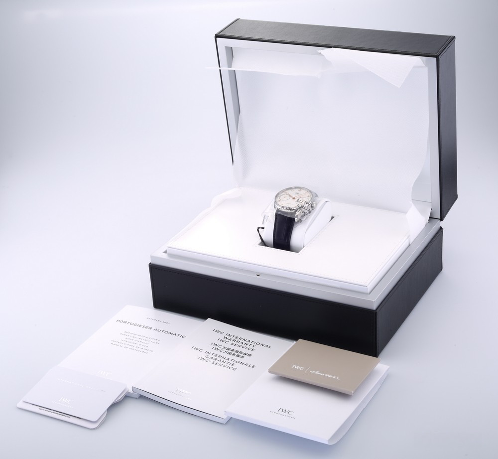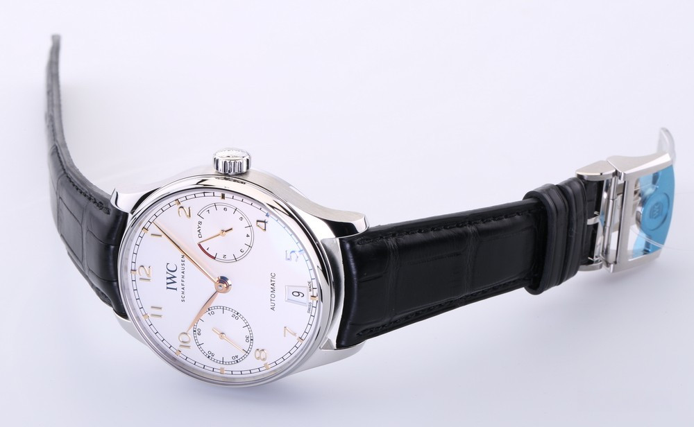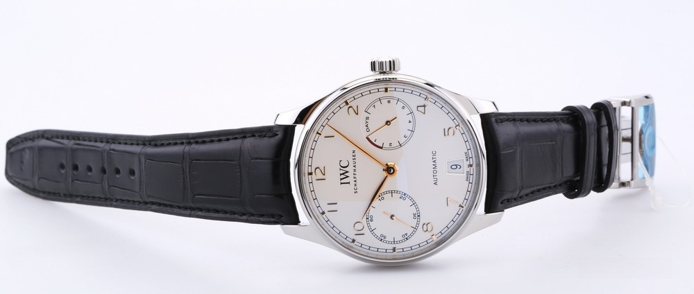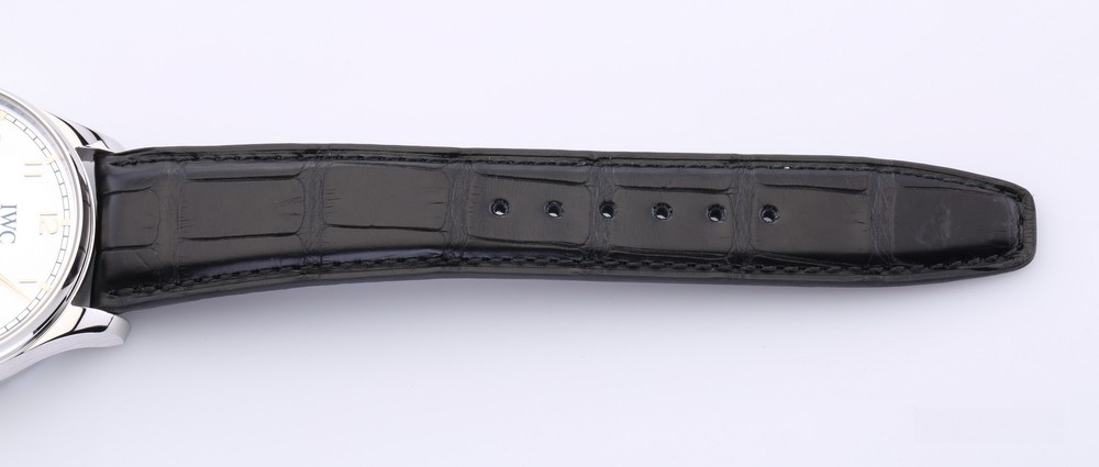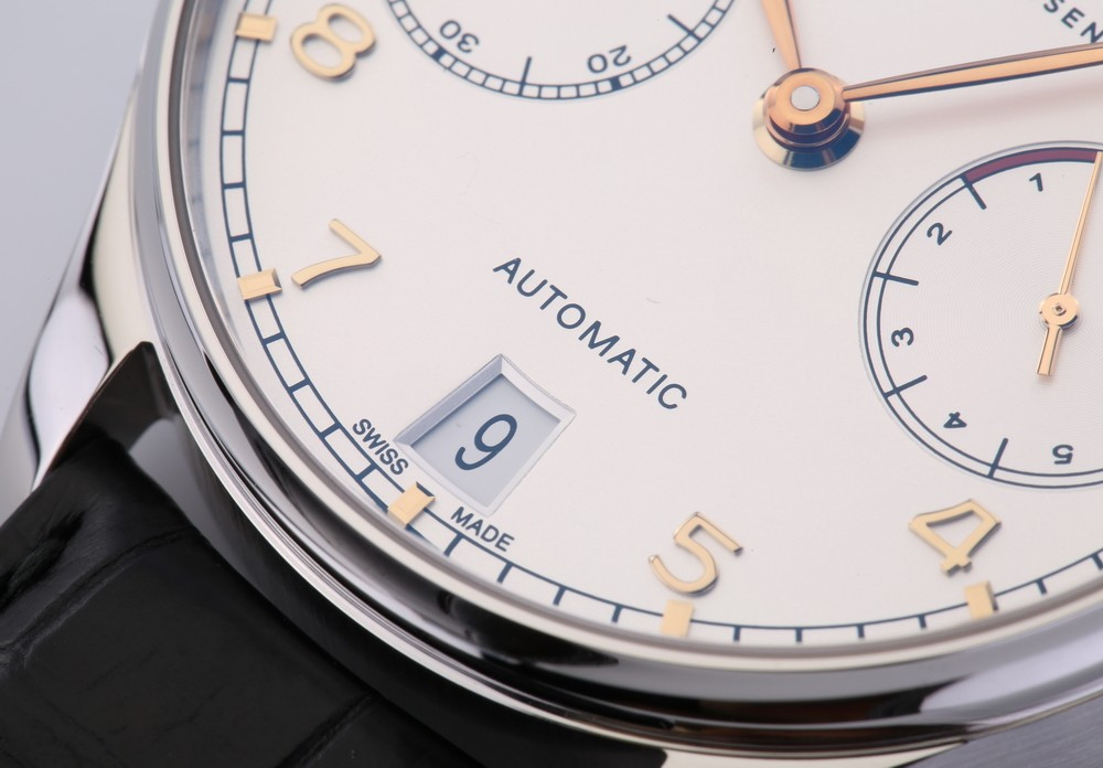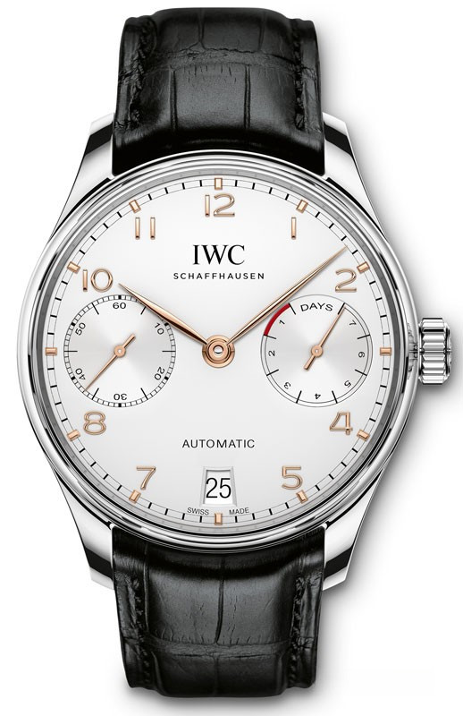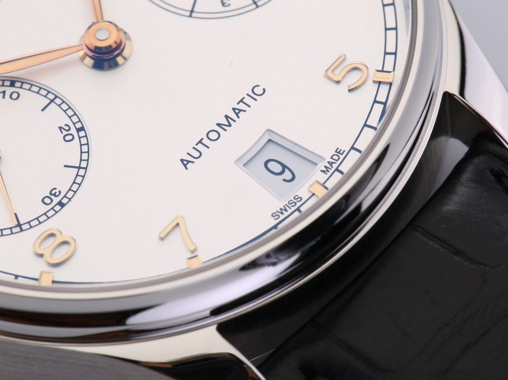 IWC Portugieser Automatic выпущены в корпусе из нержавеющей стали. Размер корпуса составляет 42.3 х 14.5 мм. Сапфировое стекло покрыто двусторонним антибликовым покрытием. На серебристом циферблате расположены центральные часовая и минутная стрелки, индикатор запаса хода на 3-х часах, апертура даты на 6-ти часах, малая секундная стрелка на 9-ти часах. Внутри корпуса установлен автоматический механизм IWC 52010 с запасом хода 7 дней. Корпус часов водонепроницаем до 30 метров. Часы комплектуются черным ремешком из кожи аллигатора с застежкой из нержавеющей стали.