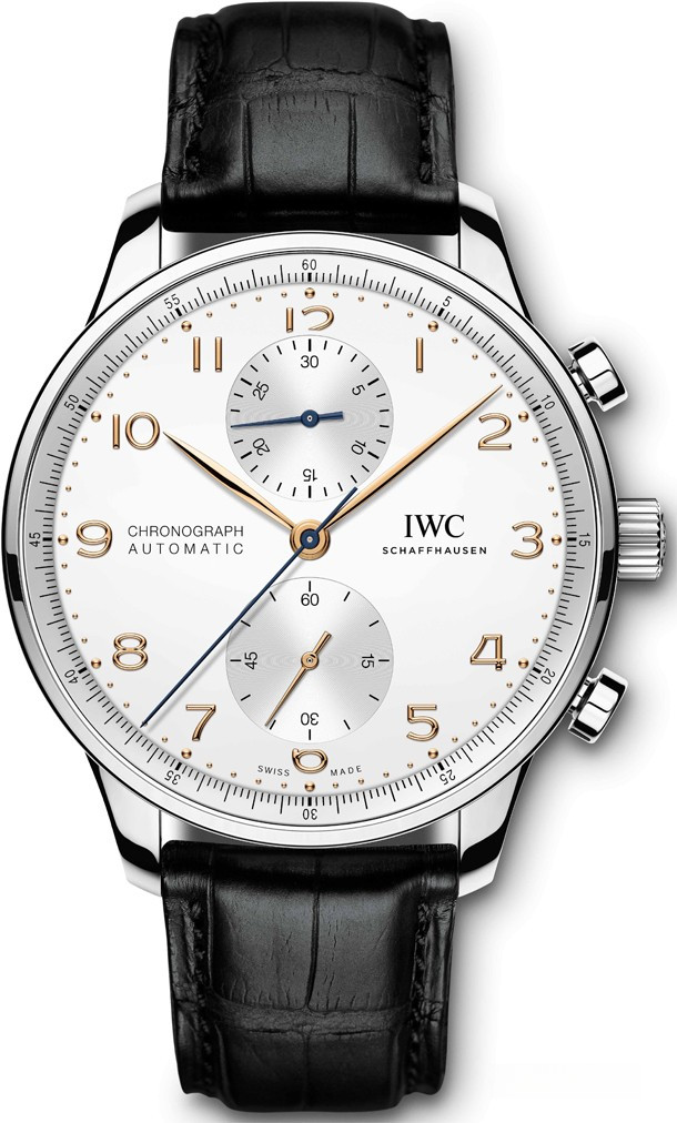 Часы IWC Portuguese Chronograph представлены в корпусе из нержавеющей стали размером 41 х 13.1 мм водонепроницаемостью 30 метров. Внутри корпуса установлен автоматический механизм, Калибр 69355, обладающий запасом хода 46 часов. На серебристом циферблате отображаются часы, минуты, секунды, счетчики хронографа. Часы поставляются на ремешке из кожи аллигатора с вставкой из нержавеющей стали.