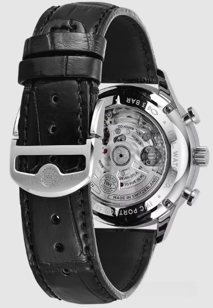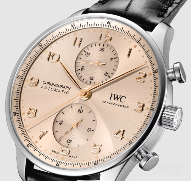 Часы IWC Portuguese Chronograph представлены в корпусе из нержавеющей стали размером 41 х 13 мм водонепроницаемостью 30 метров. Внутри корпуса установлен автоматический механизм, Калибр 69355, обладающий запасом хода 46 часов. На золотистом циферблате отображаются часы, минуты, секунды, счетчики хронографа. Часы поставляются на ремешке из кожи аллигатора с застежкой из нержавеющей стали.