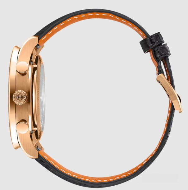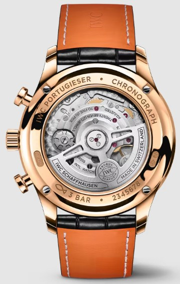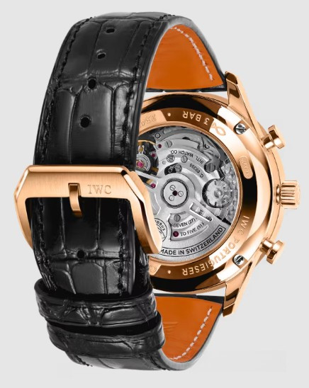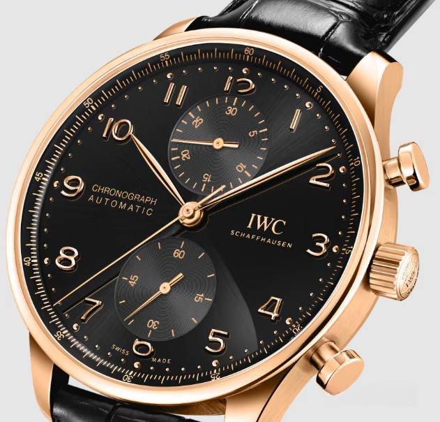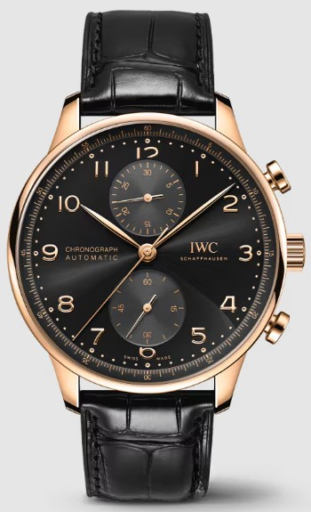 Часы IWC Portuguese Chronograph представлены в корпусе из розового золота 18к размером 41 х 13 мм водонепроницаемостью 30 метров. Внутри корпуса установлен автоматический механизм, Калибр 69355, обладающий запасом хода 46 часов. На черном циферблате отображаются часы, минуты, секунды, счетчики хронографа. Часы поставляются на ремешке из кожи аллигатора с золотой застежкой.
