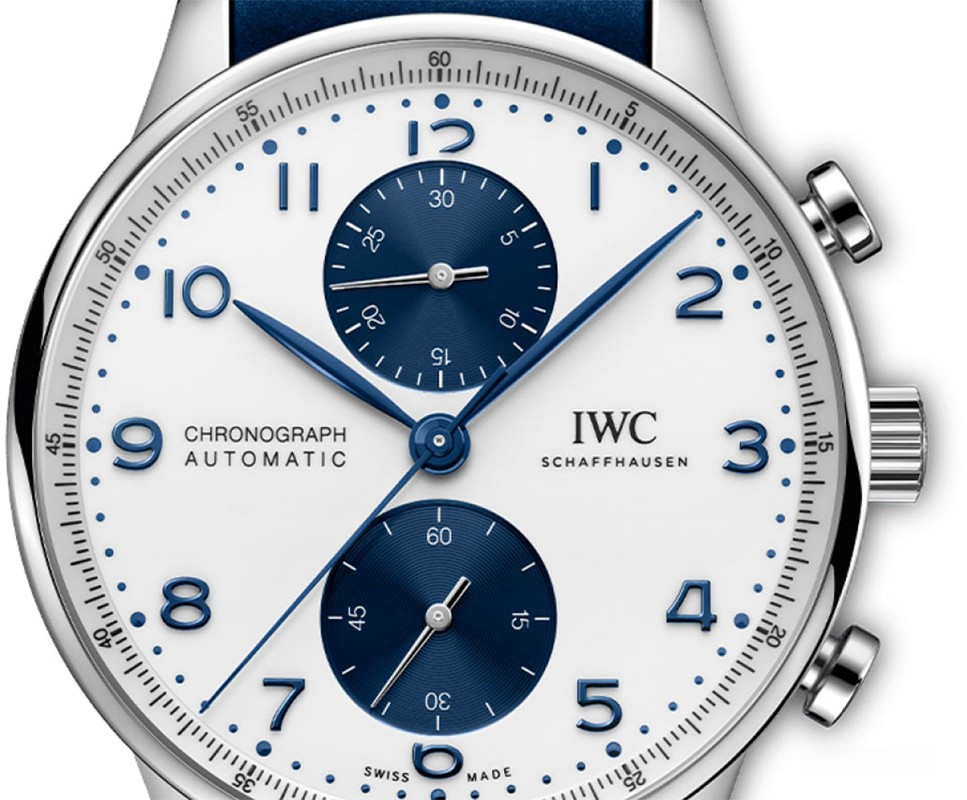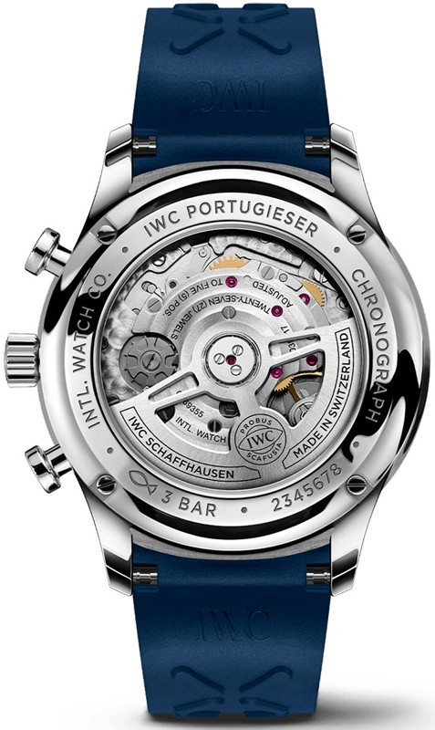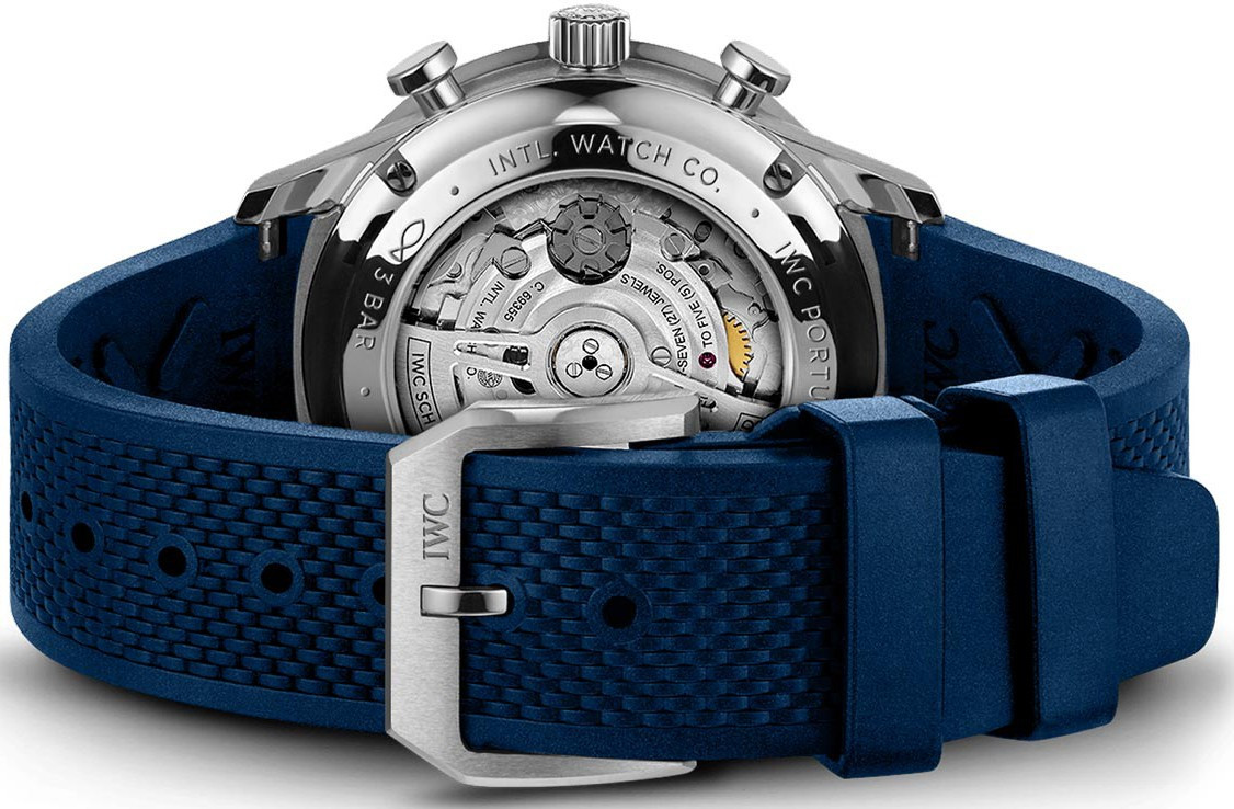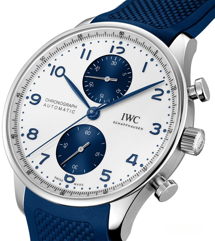 Часы IWC Portuguese Chronograph представлены в корпусе из нержавеющей стали размером 41 х 13 мм водонепроницаемостью 30 метров. Внутри корпуса установлен автоматический механизм, Калибр 69355, обладающий запасом хода 46 часов. На белом с синим циферблате отображаются часы, минуты, секунды, счетчики хронографа. Часы поставляются на каучуковом ремешке с застежкой из нержавеющей стали.