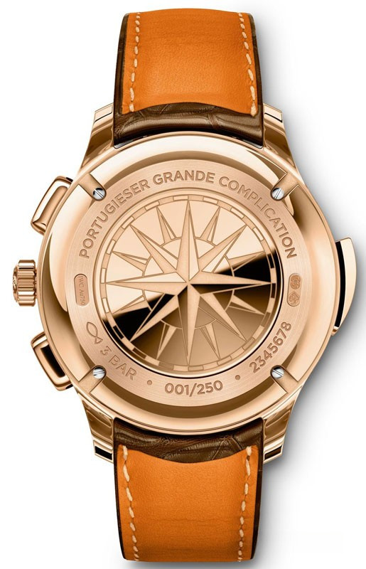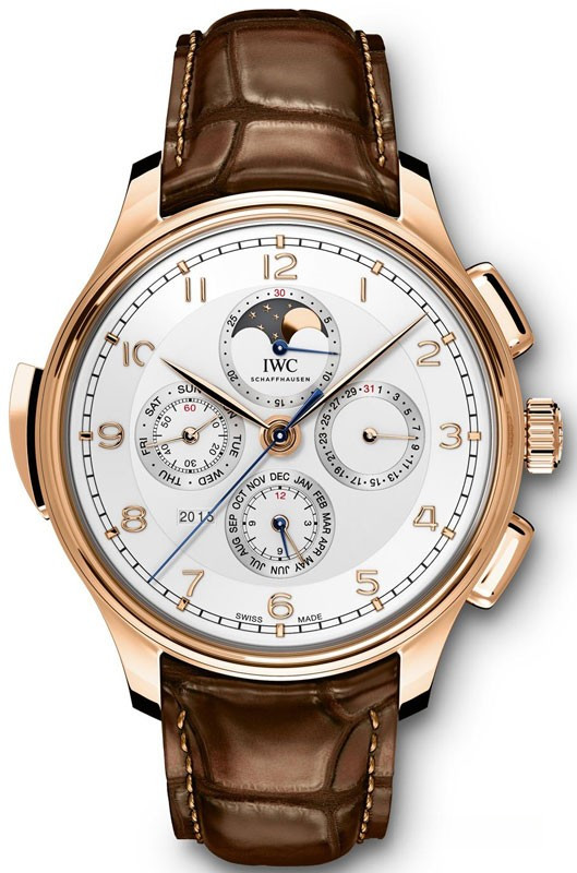 Астрономические часы IWC Portuguese Grande Complication IW377602 с вечным календарем, репетиром и хронографом выпущены в круглом корпусе из розового золота 18к. Размер составляет 45 х 16,5 мм, водонепроницаемость 30 м. Внутри корпуса установлен автоматический механизм, Калибр IWС 79091, обеспечивающий запас хода 44 часа. На серебристом циферблате отображаются часы, минуты, секунды, дата, день недели, месяц, год, фаза луны. Часы комплектуются ремешком из кожи аллигатора с золотой откидной застежкой. Часы представлены ограниченной серией 250 штук.