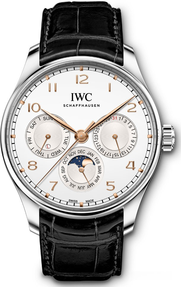 Вечный календарь IWC, разработанный Куртом Клаусом в 1980-е годы, автоматически делает поправку на разную продолжительность месяцев и високосный цикл и легко настраивается посредством одной заводной головки. Сегодня это усложнение впервые встроено в механизм, входящий в семейство калибра 82000. Модель Portugieser Perpetual Calendar 42 отображает дату, месяц и день недели на трех индикаторах в положениях «3 часа», «6 часов» и « 9 часов». Кроме того, на ее циферблате отображаются фазы Луны и високосный цикл. Механизм системы Пеллатона, применяемый в калибре 82650, содержит керамические компоненты и обеспечивает накопление запаса хода 60 часов. Модель диаметром 42 мм имеет корпус из нержавеющей стали, посеребренный циферблат, покрытые золотом стрелки и накладные метки. Элегантный, неизменно актуальный дизайн Portugieser дополняет черный ремешок Santoni из кожи аллигатора.