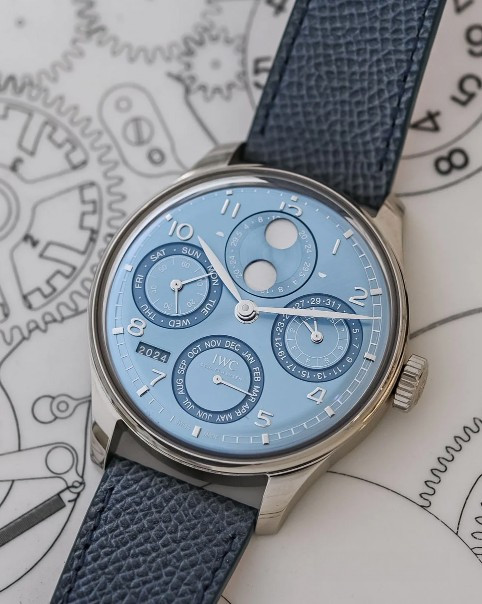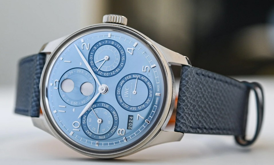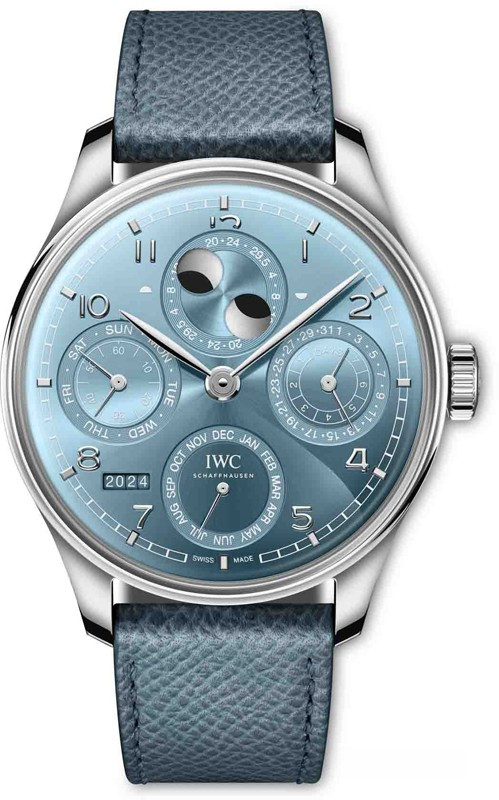 Часы IWC Portuguese Perpetual Calendar 44.4 представлены в корпусе размером 44.4 х 14.9 мм из белого золота 18к водонепроницаемостью 50 метров. Внутри корпуса установлен автоматический механизм, Калибр 52616, обладающий запасом хода 7 дней. На голубом циферблате отображаются часы, минуты, секунды, дата, день недели, месяц, фаза луны, цикл високосного года. Часы поставляются на кожаном ремешке с золотой застежкой.