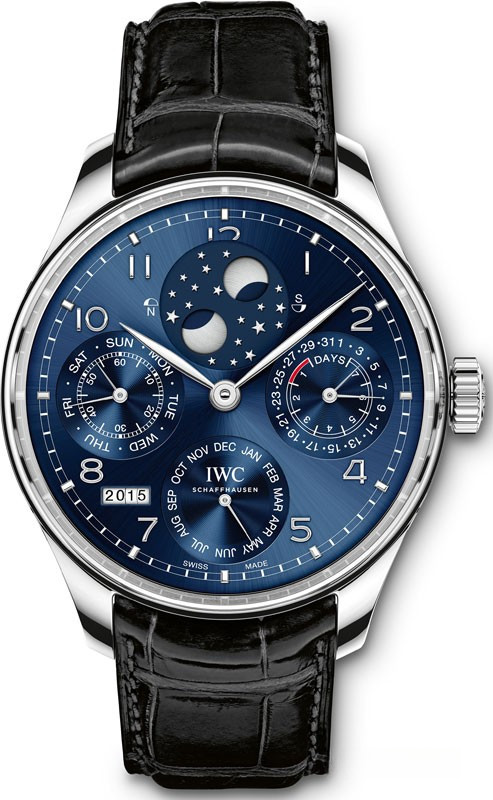 Часы Portugieser Perpetual Calendar скрывают в себе усложненный часовой механизм с автоматической системой подзавода Пеллатона, Калибр 52615, который обеспечивает 7-дневной резервный ход при полном заводе. Механизм собран на 54 драгоценных камнях, имеет ротор из цельного розового золота и воронеными винтами. Корпус изогнут, что позволяет комфортно охватить запястье руки, диаметром 44,20 мм и высотой 15,3 мм, выполнен из 18-каратного белого золота. Стекло из сапфира защищает часы с обеих сторон часов. Циферблат синего цвета, украшен минутной шкалой в виде железнодорожной колеи. Индикатор двойного указателя фаз Луны изображает звездное небо с луной и звездами, парящими в безграничном пространстве в положении на 12 часов. Малый счетчик совместил индикацию дня недели и малую секундную стрелку со стоп-функцией, в положении на 9 часов. Указатель даты совмещен с индикацией запаса хода в едином счетчике в положении на 3 часа. Счетчик в положении на 6 часов отвечает за индикацию месяца. Окно в положении на 7 часов показывает год. Также часы оснащены усложненной функцией четырехзначного указателя года. Часы укомплектованы ремешком черного цвета из кожи аллигатора с раскладной застежкой из белого золота.