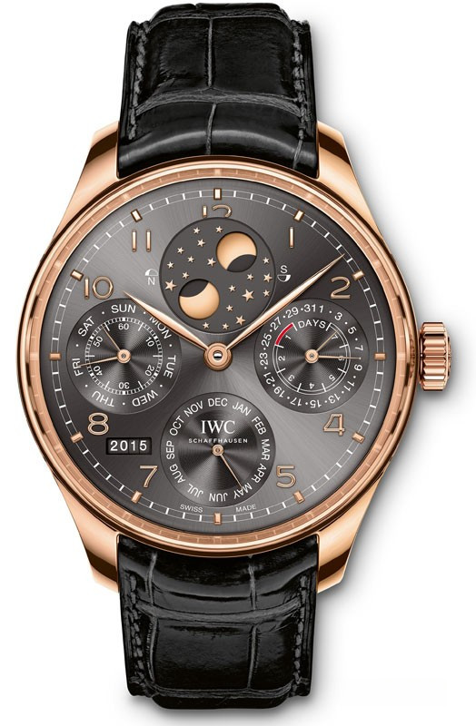 Часы Portugieser Perpetual Calendar скрывают в себе усложненный часовой механизм с автоматической системой подзавода Пеллатона, Калибр 52615, который обеспечивает 7-дневной резервный ход при полном заводе. Механизм собран на 54 драгоценных камнях, имеет ротор из цельного розового золота и воронеными винтами. Корпус изогнут, что позволяет комфортно охватить запястье руки, диаметром 44,20 мм и высотой 15,3 мм, выполнен из 18-каратного розового золота. Стекло из сапфира защищает часы с обеих сторон часов. Циферблат серого цвета украшен минутной шкалой в виде железнодорожной колеи. Индикатор двойного указателя фаз Луны изображает звездное небо с луной и звездами, парящими в безграничном пространстве в положении на 12 часов. Малый счетчик совместил индикацию дня недели и малую секундную стрелку со стоп-функцией, в положении на 9 часов. Указатель даты совмещен с индикацией запаса хода в едином счетчике в положении на 3 часа. Счетчик в положении на 6 часов отвечает за индикацию месяца. Окно в положении на 7 часов показывает год. Также часы оснащены усложненной функцией четырехзначного указателя года. Часы укомплектованы ремешком черного цвета из кожи аллигатора с раскладной застежкой из розового золота.