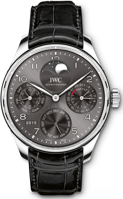 Мужские наручные часы IWC Portuguese Perpetual Calendar выпущены в корпусе из белого золота 18к размером 44.2 мм и водонепроницаемостью до 30 метров. Внутри корпусе установлен автоматический механизм с запасом хода 168 часов. На сером циферблате посредством центральных стрелок отображаются часы и минуты. В позиции 12-ти часов находится индикатор фазы Луны. На 3-х часах расположены индикатор запаса хода и даты. В районе 6-ти часов расположен индикатор месяцев. Между 7-ю и 8-ю часами отображается четырехзначное число текущего года. На 9-ти часах находится малая секундная стрелка и указатель дней недели. Часы с вечным календарем комплектуются черным ремешком с застежкой из белого золота 18к.