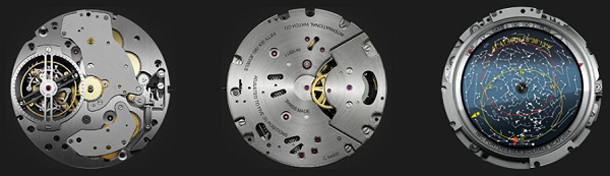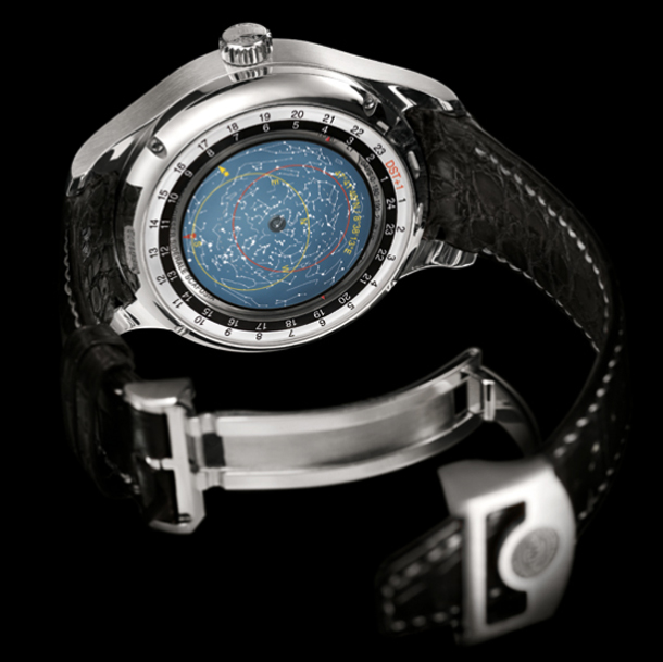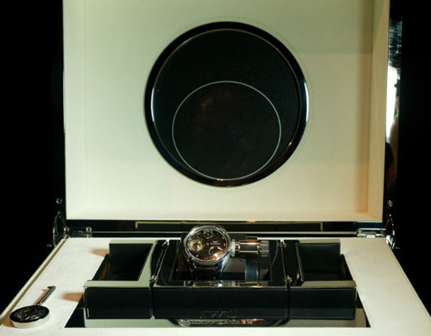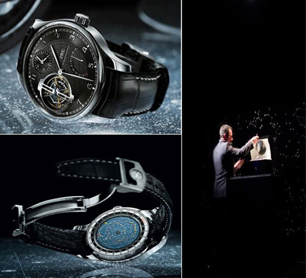 Астрономические часы IWC Portuguese Siderale Scafusia IW5041 с вечным календарем и турбийоном выпущены в круглом корпусе из платины. Размер составляет 46 мм, водонепроницаемость 30 м. Внутри корпуса установлен механизм с ручным заводом, обеспечивающий запас хода 96 часов. На черном гильошированном циферблате отображаются часы, минуты, секунды, дата, день недели, цикл високосного года, время восхода/заката солнца, карта звездного неба. Часы комплектуются ремешком из кожи аллигатора с платиновой вставкой.