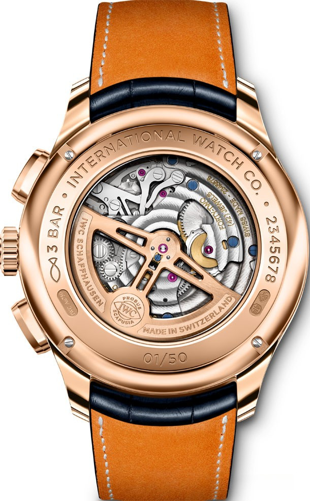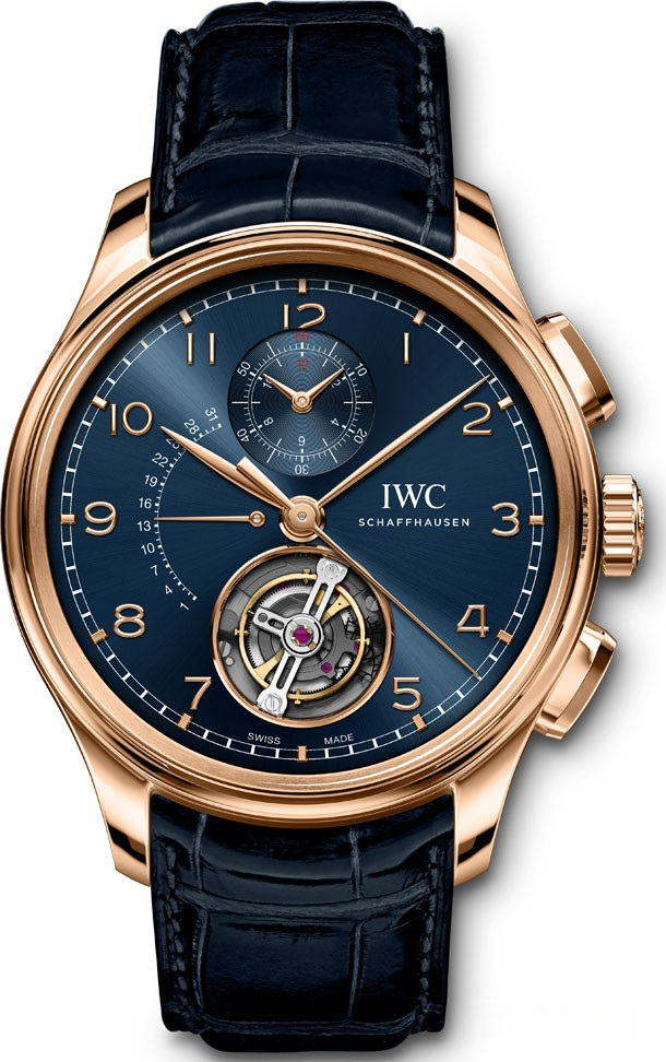 Немногие усложнения категории Высокое часовое искусство по зрелищности сравнятся с турбийоном. Данный модуль (в переводе с французского «турбийон» означает «вихрь») представляет собой колесо баланса, заключенное в каретку и вращающееся вокруг своей оси. Циферблат с турбийоном выглядит очень эффектно, но не только. Постоянное вращение уменьшает влияние гравитации на систему хода и повышает точность часов. Модель Portugieser Tourbillon Rétrograde Chronograph оснащена парящим минутным турбийоном, размещенным в положении «6 часов». Кроме того, также в ней имеются ретроградный указатель даты и хронограф с функцией flyback. Модель темно-синего и золотого цвета, выпущенную специальной серией из 50 экземпляров, можно приобрести только в бутиках IWC. Корпус изготовлен из 18-каратного золота Armor Gold®. Благодаря оптимизированной микроструктуре данный материал по прочности существенно превышает традиционные золотые сплавы. Синий циферблат, покрытые золотом стрелки и накладные метки из 18-каратного золота подчеркивают морской характер этих эксклюзивных часов. Автоматический мануфактурный калибр IWC 89900 имеет запас хода 68 часов. Его анкер и колесо спуска обработаны по технологии Diamond Shell®, которая снижает трение и улучшает передачу энергии в механизме.