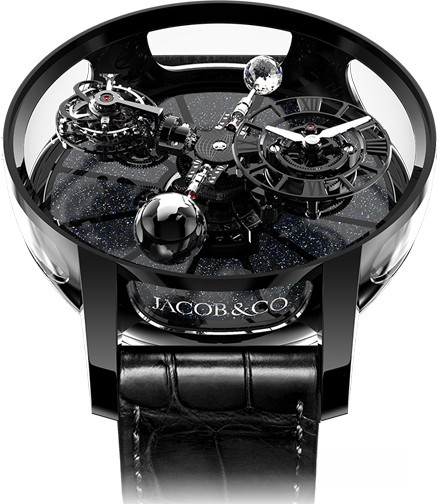 Часы Astronomia Tourbillon, представленные мануфактурой Jacob & Co., являются уменьшенной копией небесных тел, расположенных на запястье. Новинка производит неизгладимое впечатление. Раздвигая рамки технических возможностей, трехмерный Калибр JCAM10 позволяет этим часам представить потрясающую хореографию базирующихся на осях индикаторов. Центральные оси и четыре стрелки с их модулями совершают полный оборот за 20 минут. Турбийон сочетает пятиминутный оборот вокруг вертикальной оси с горизонтальным 60-секундным оборотом. С противоположной стороны находится субциферблат с индикацией часов и минут, которые всегда на виду у владельца часов. Таким образом, циферблат получается не перегруженным функциями. На перекрестной оси по обе стороны расположен лакированный глобус и бриллиантовая луна. Поверхность бриллианта имеет 288 граней, которые отражают все лучи света во всех направлениях и освещают звездное небо сквозь турбийон и свободные оси. В конечном результате получается незабываемое световое шоу, которое не повторяется дважды.