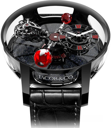 Часы Astronomia Tourbillon, представленные мануфактурой Jacob & Co., являются уменьшенной копией небесных тел, расположенных на запястье. Новинка производит неизгладимое впечатление. Раздвигая рамки технических возможностей, трехмерный Калибр JCAM10 позволяет этим часам представить потрясающую хореографию базирующихся на осях индикаторов. Центральные оси и четыре стрелки с их модулями совершают полный оборот за 20 минут. Турбийон сочетает пятиминутный оборот вокруг вертикальной оси с горизонтальным 60-секундным оборотом. С противоположной стороны находится субциферблат с индикацией часов и минут, которые всегда на виду у владельца часов. Таким образом, циферблат получается не перегруженным функциями. На перекрестной оси по обе стороны расположен лакированный глобус и бриллиантовая луна. Поверхность бриллианта имеет 288 граней, которые отражают все лучи света во всех направлениях и освещают звездное небо сквозь турбийон и свободные оси. В конечном результате получается незабываемое световое шоу, которое не повторяется дважды.