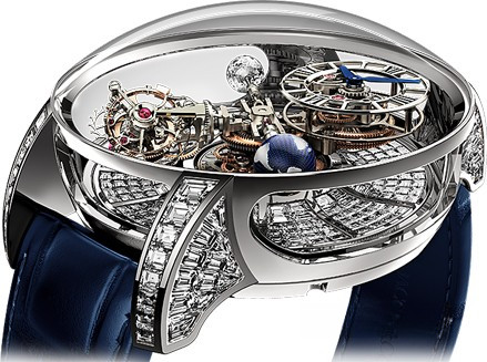 Часы Astronomia Tourbillon, представленные мануфактурой Jacob & Co., являются уменьшенной копией небесных тел, расположенных на запястье. Новинка производит неизгладимое впечатление. Раздвигая рамки технических возможностей, трехмерный Калибр JCAM10 позволяет этим часам представить потрясающую хореографию базирующихся на осях индикаторов. Центральные оси и четыре стрелки с их модулями совершают полный оборот за 20 минут. Турбийон сочетает пятиминутный оборот вокруг вертикальной оси с горизонтальным 60-секундным оборотом. С противоположной стороны находится субциферблат с индикацией часов и минут, которые всегда на виду у владельца часов. Таким образом, циферблат получается не перегруженным функциями. На перекрестной оси по обе стороны расположен лакированный глобус и бриллиантовая луна. Поверхность бриллианта имеет 288 граней, которые отражают все лучи света во всех направлениях и освещают звездное небо сквозь турбийон и свободные оси. В конечном результате получается незабываемое световое шоу, которое не повторяется дважды.